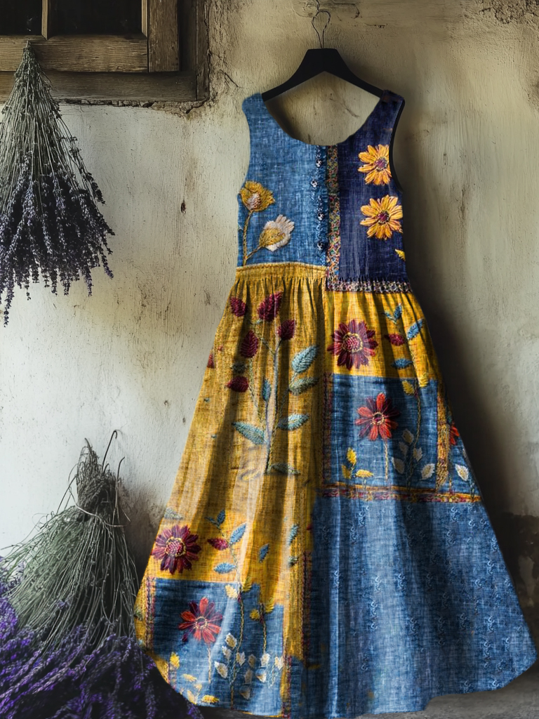 Women's Floral Art Print Round Neck Sleeveless Cotton Pocket Dresses