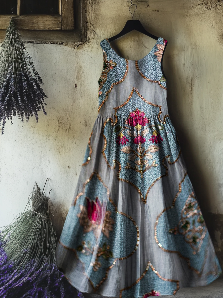 Women's Floral Art Print Round Neck Sleeveless Cotton Pocket Dresses
