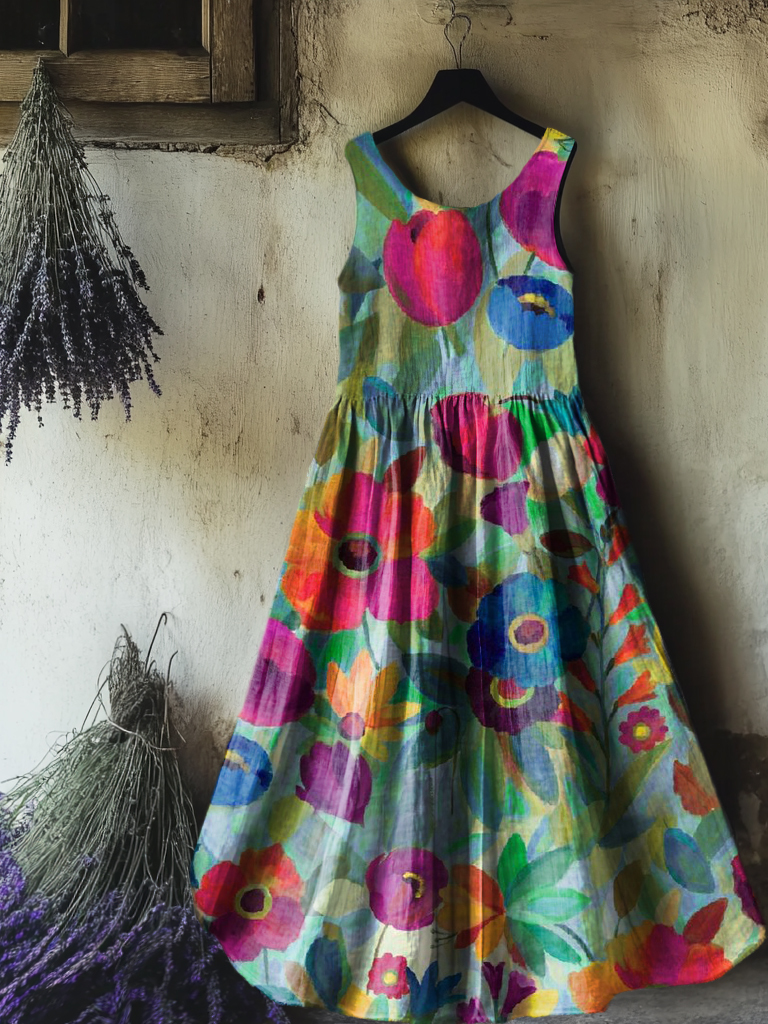 Women's Floral Art Print Round Neck Sleeveless Cotton Pocket Dresses