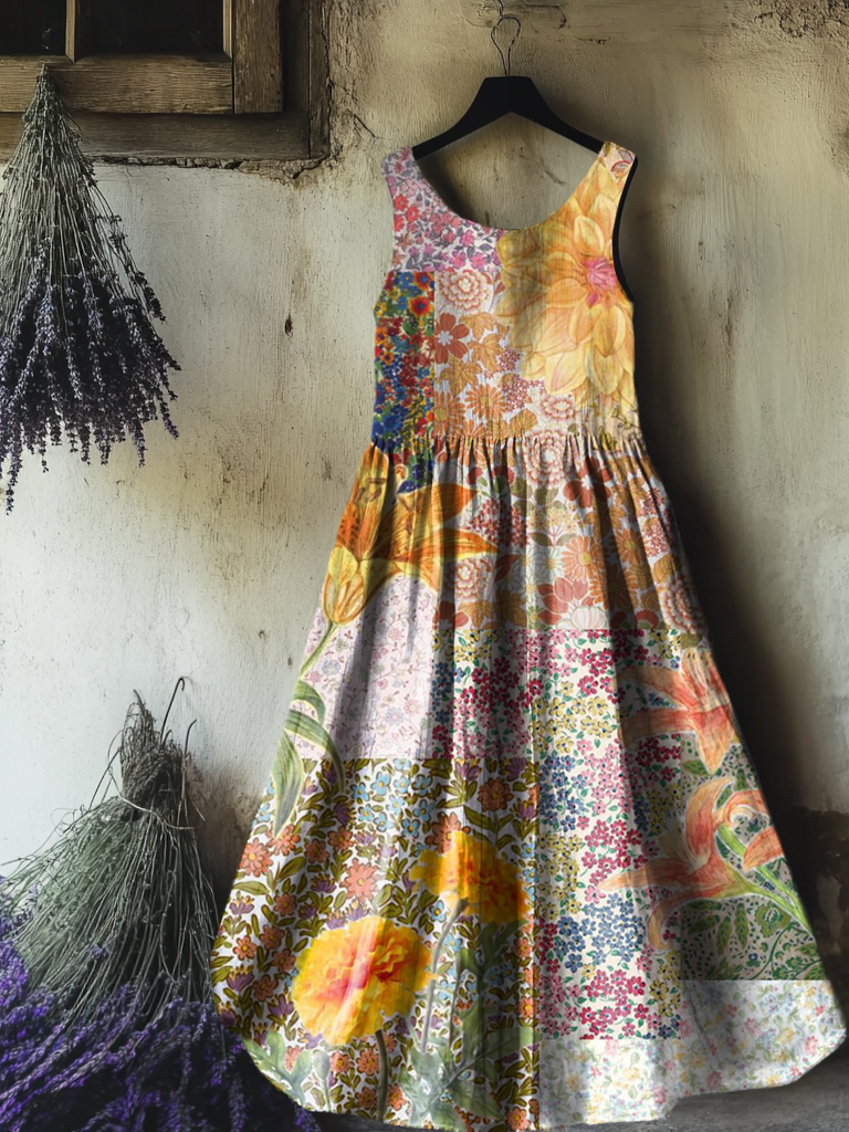 Women's Floral Art Print Round Neck Sleeveless Cotton Pocket Dresses