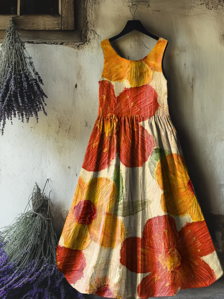 Women's Floral Art Print Sleeveless Cotton Pocket Dress