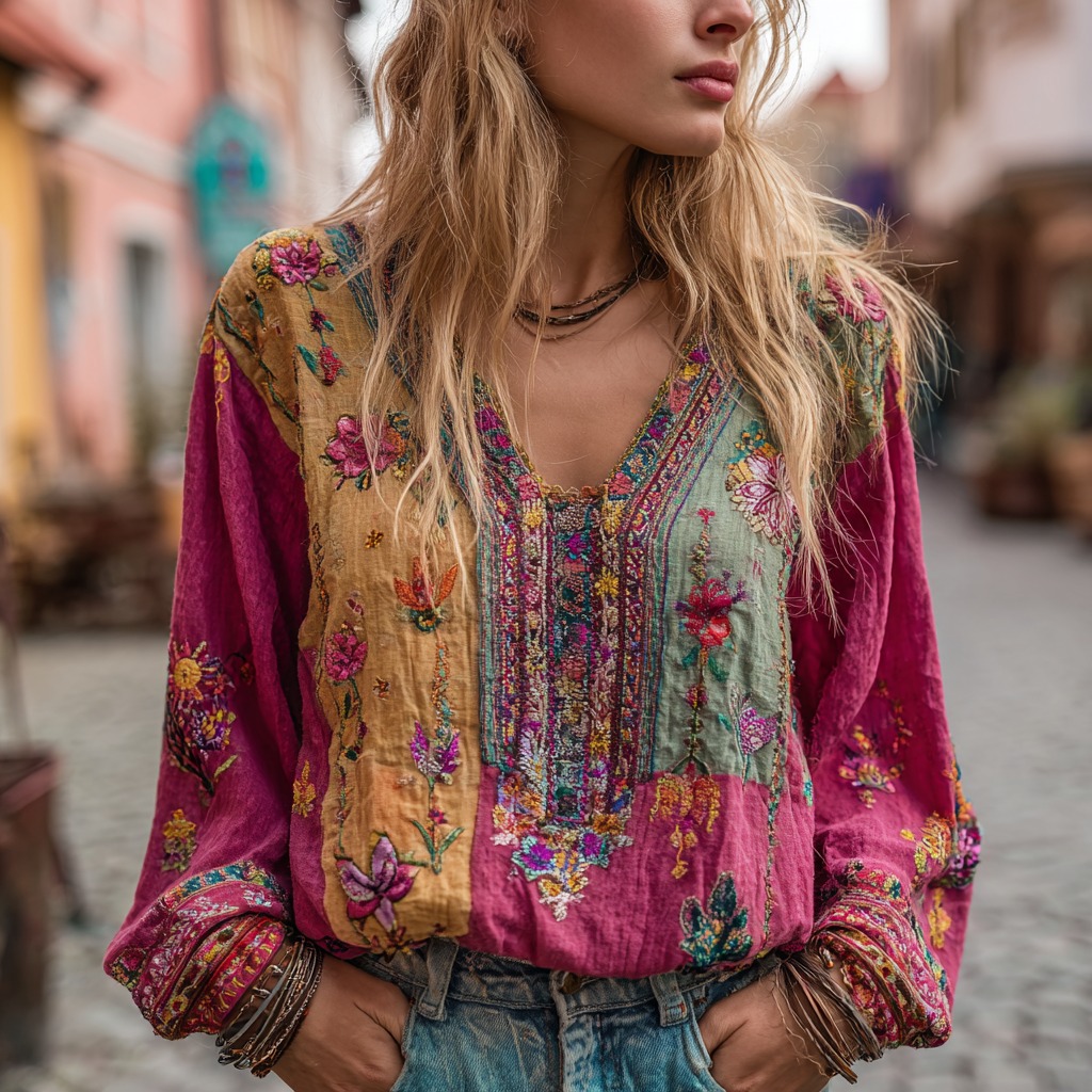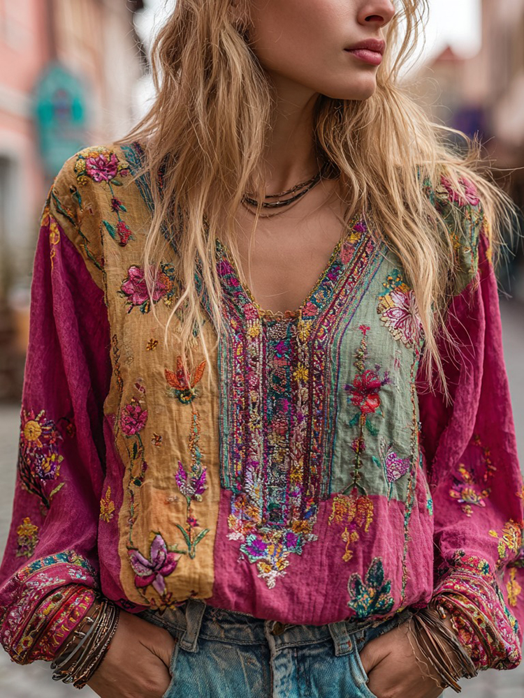 Women's Floral Embroidery Boho Colorblock Art Linen Blend V-neck Shirt