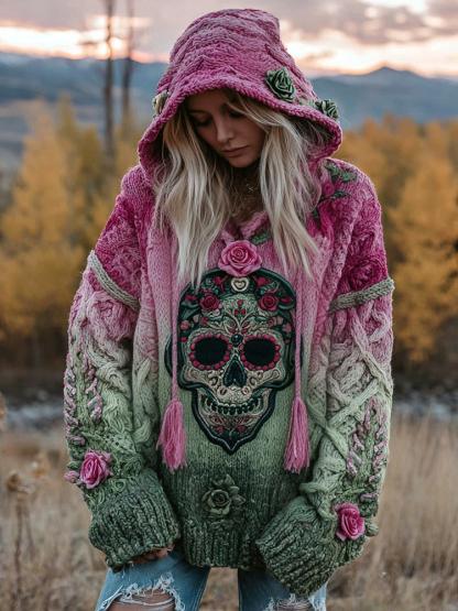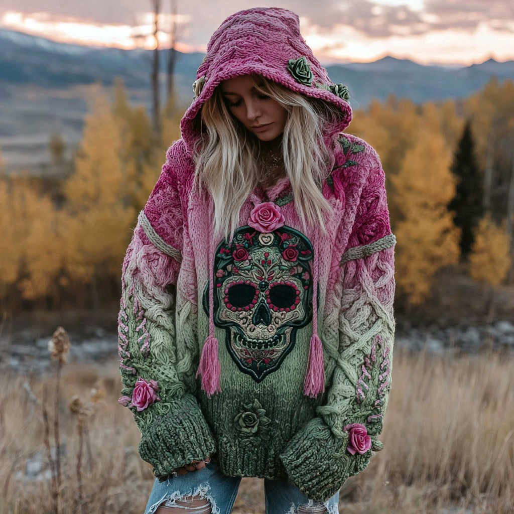 Women's Gradient Rose And Skull Inspired Chunky Knit Hooded Sweater