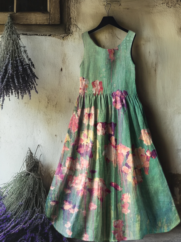 Women's Painting Floral Art Print Sleeveless Cotton Pocket Dress