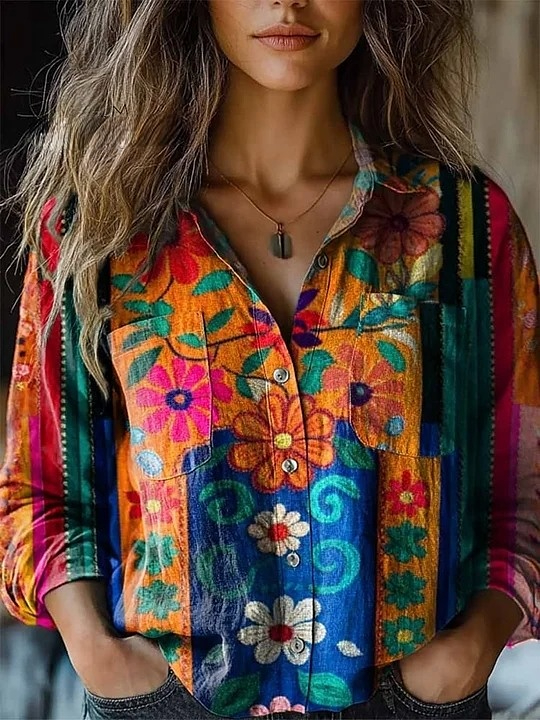 Women's Retro Colorful Floral Pattern Casual Long Sleeve Comfortable Cotton Shirt
