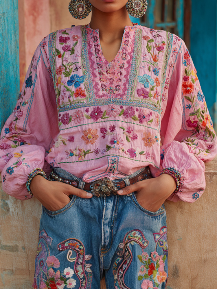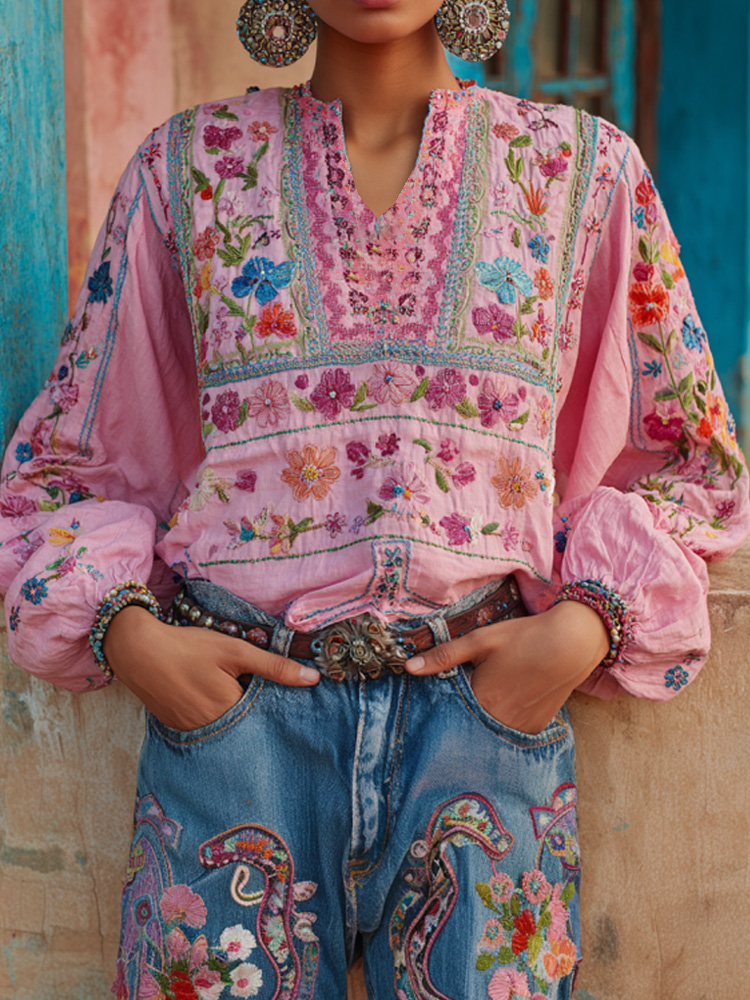 Women's Retro Ethnic Pink Awareness Flower Embroidery Printed Top