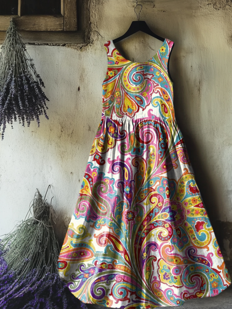 Women's Retro Paisley Floral Art Print Sleeveless Cotton Pocket Dress