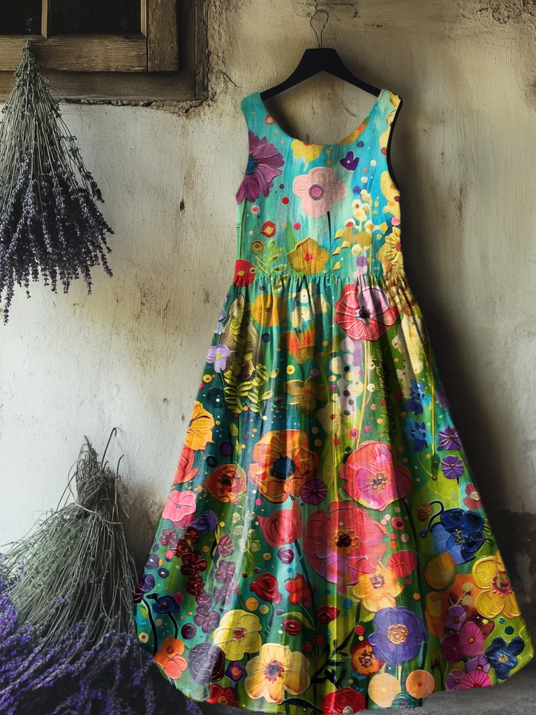 Women's Vintage Bohemian Floral Art Print Sleeveless Cotton Pocket Dress