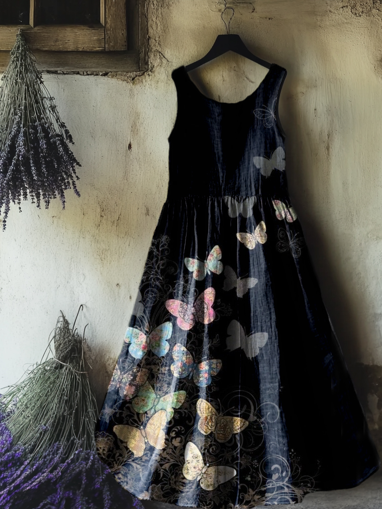 Women's Vintage Butterfly Art Print Sleeveless Cotton Pocket Dress