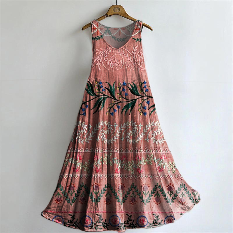 Women's Vintage Ethnic Floral Art Print Crew Neck Sleeveless Cotton Pocket Dress