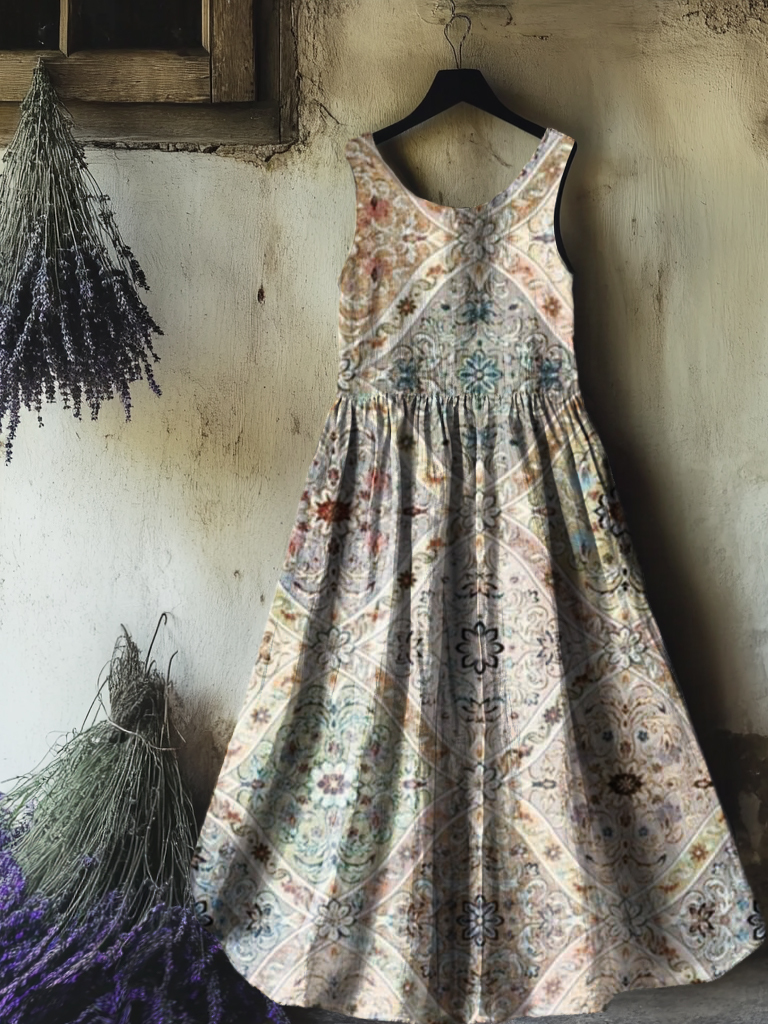 Women's Vintage Ethnic Floral Art Print Sleeveless Cotton Pocket Dress