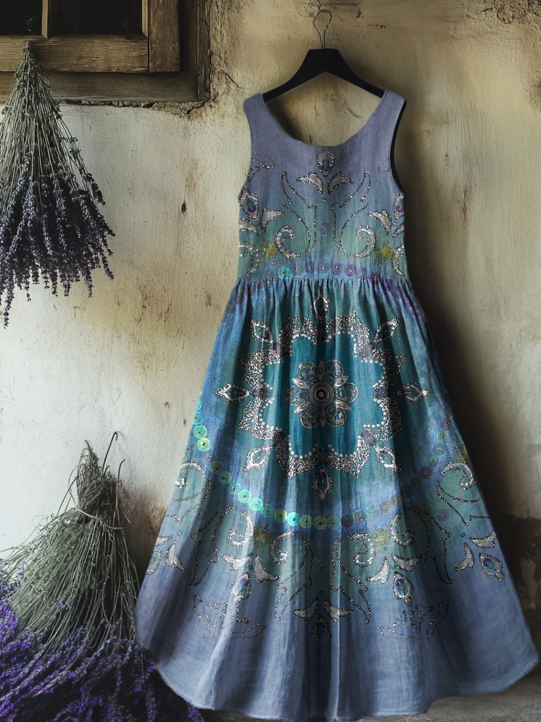 Women's Vintage Ethnic Floral Art Print Sleeveless Cotton Pocket Dress