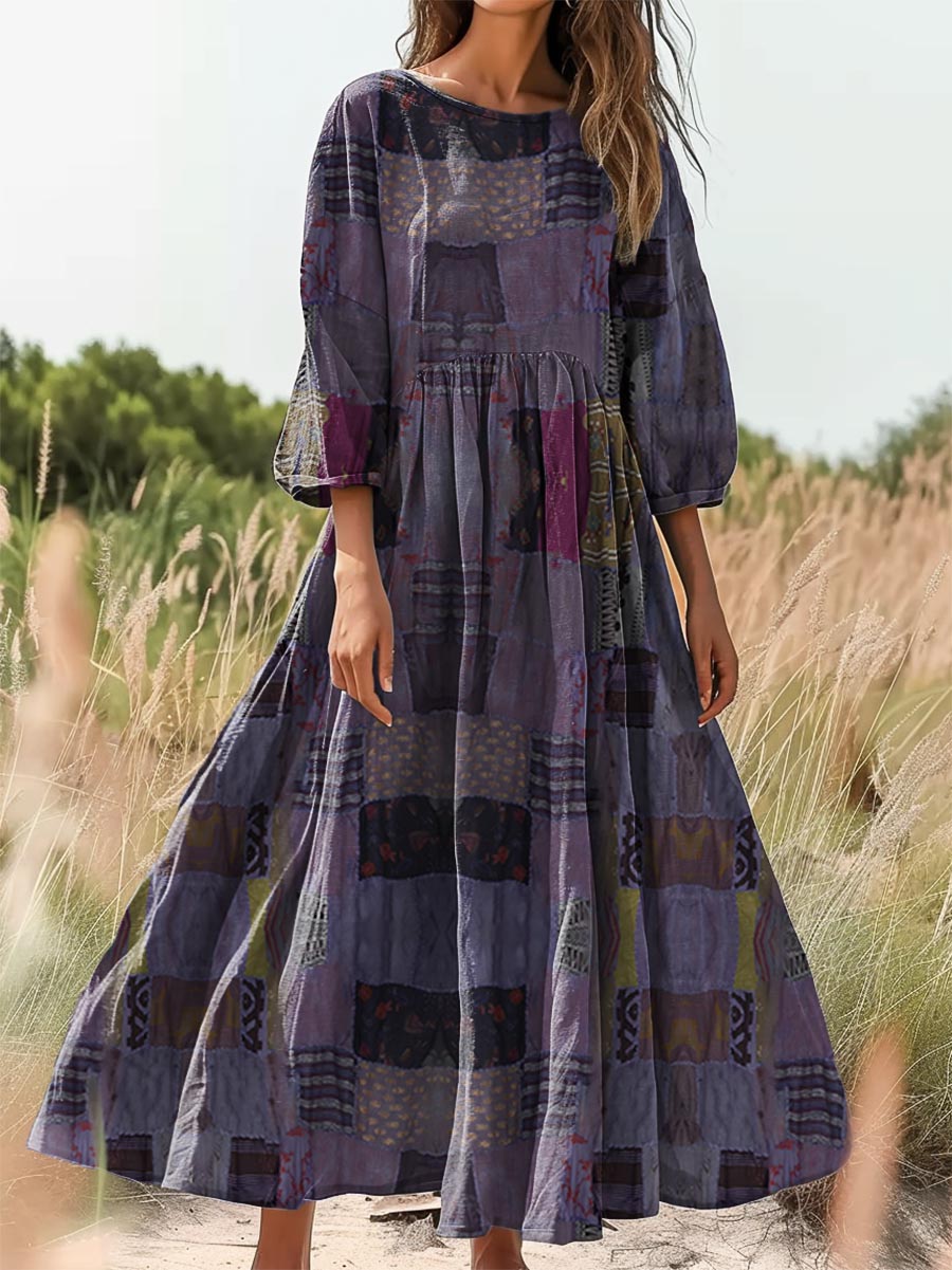 Women's Vintage Ethnic Patchwork Print Flowy Cotton Crew Neck Dress
