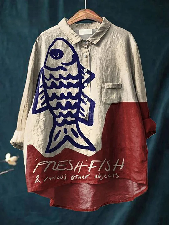Women's Vintage Fish Art Print Casual Cotton And Linen Shirt