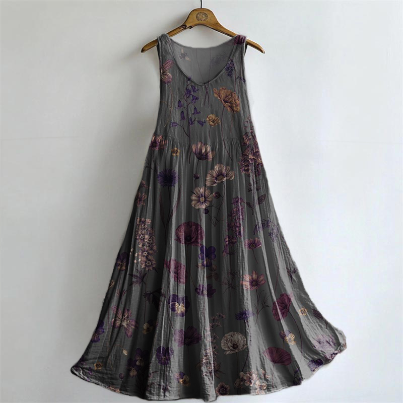Women's Vintage Floral Art Print Crew Neck Sleeveless Cotton Pocket Dress