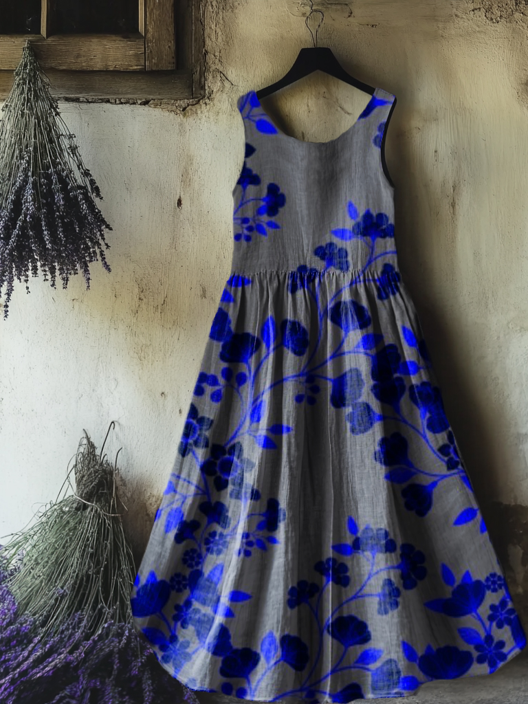 Women's Vintage Floral Art Print Sleeveless Cotton Pocket Dress