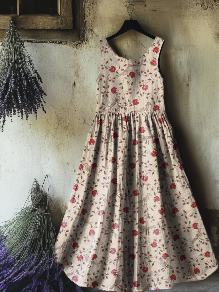 Women's Vintage Floral Art Print Sleeveless Cotton Pocket Dress
