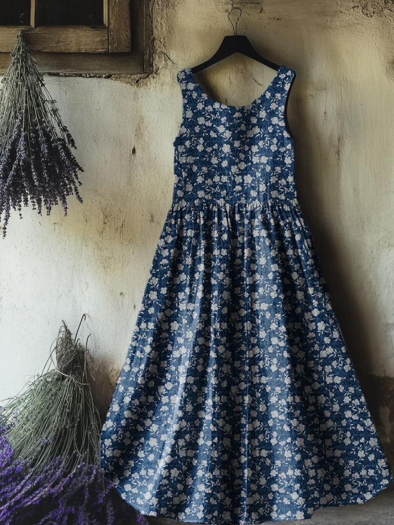 Women's Vintage Floral Art Print Sleeveless Cotton Pocket Dress