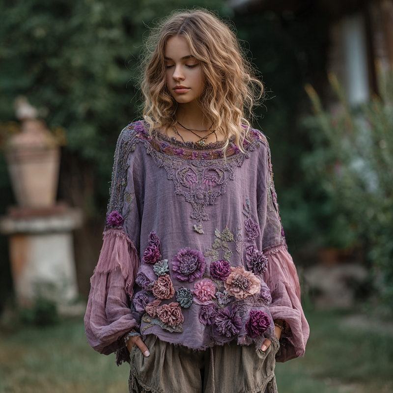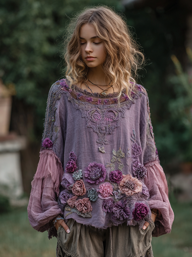 Women's Vintage Purple Floral Embroidery Art Crew Neck Shirt