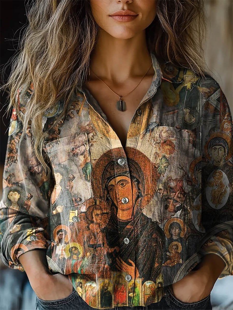 Women's Vintage Religion Pattern Art Print Casual Long Sleeve Comfortable Cotton Shirt