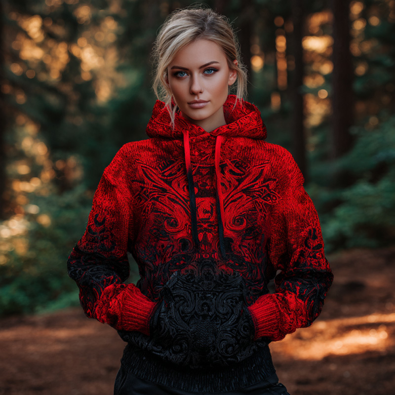 Women's Vintage Viking Tribal Celtic Skull Gradient Art Chunky Knit Hooded Sweater