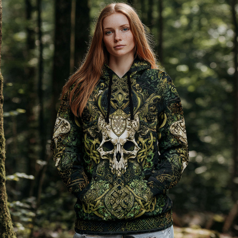 Women's Vintage Viking Tribal Celtic Skull Gradient Art Chunky Knit Hooded Sweater