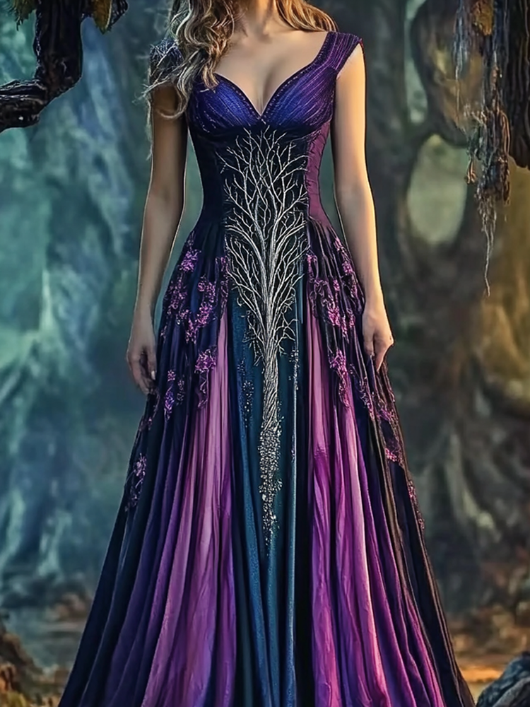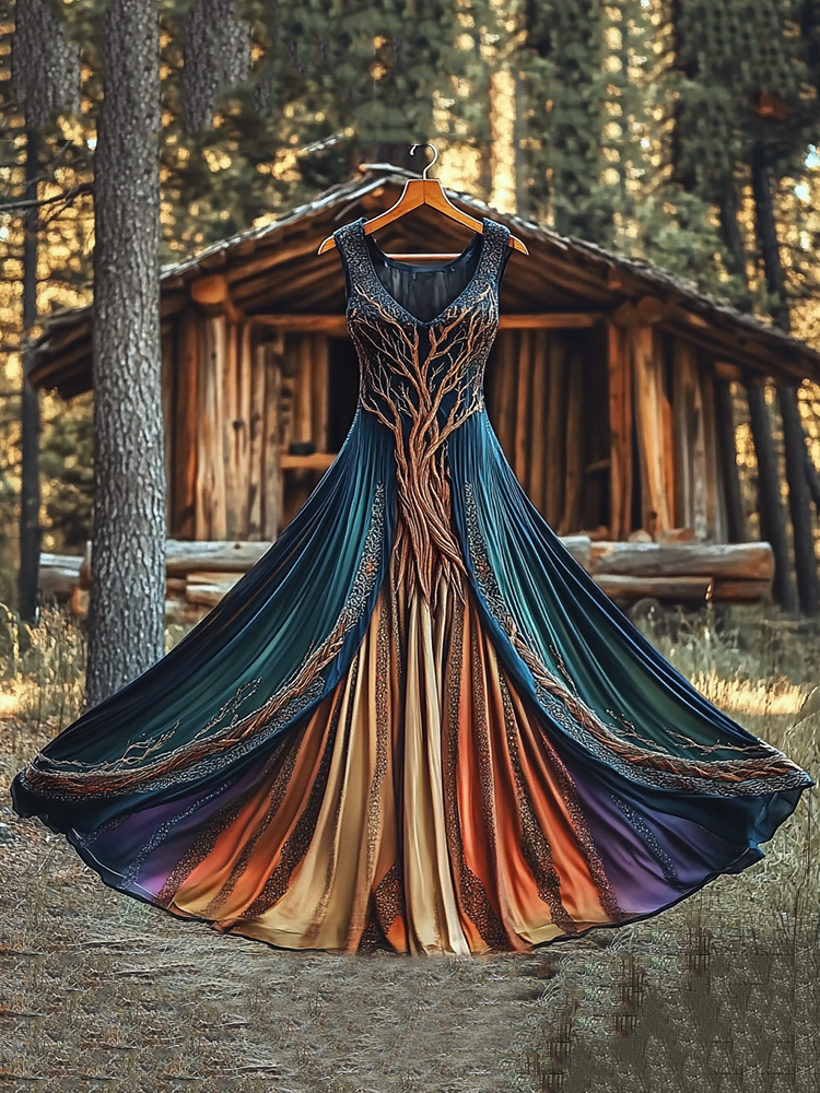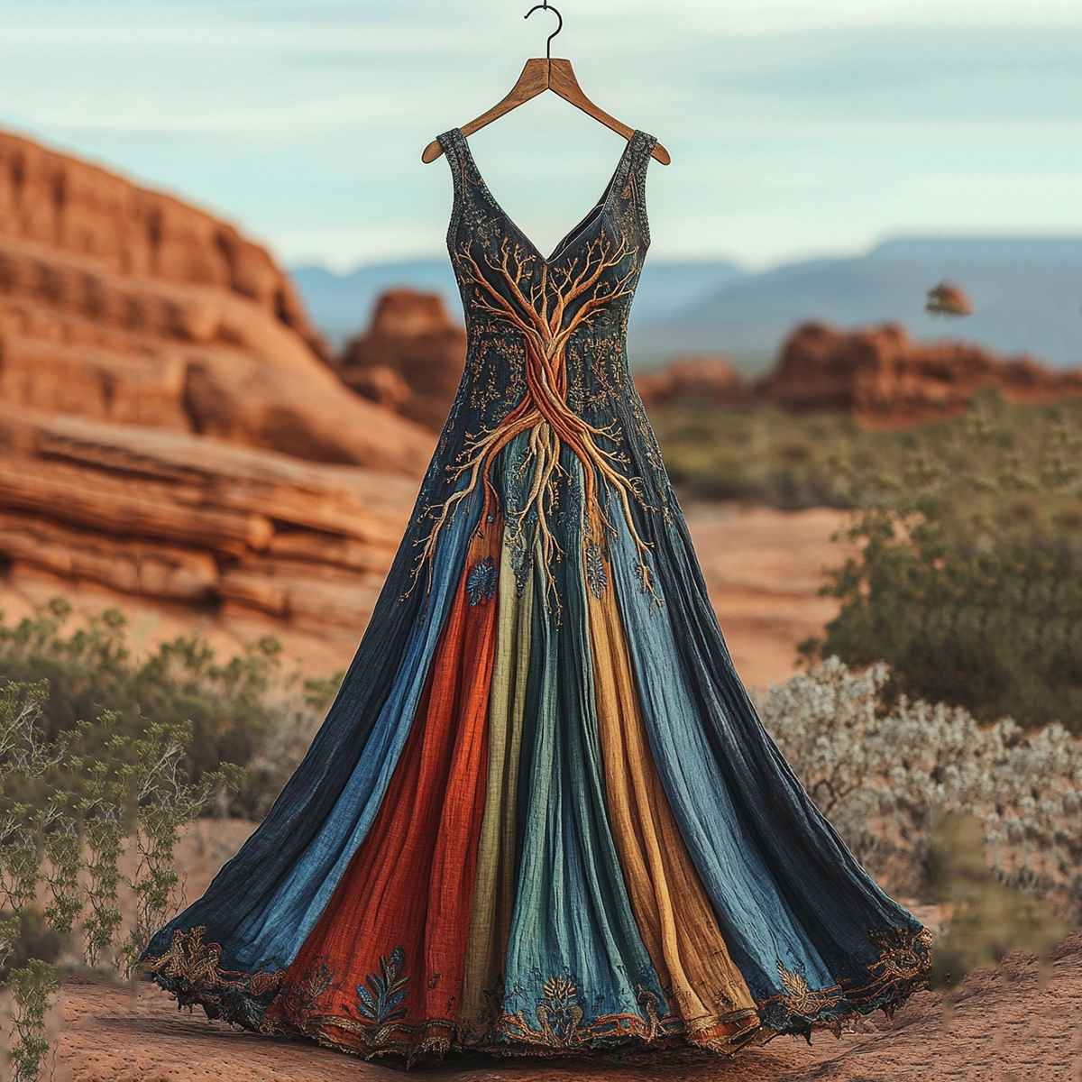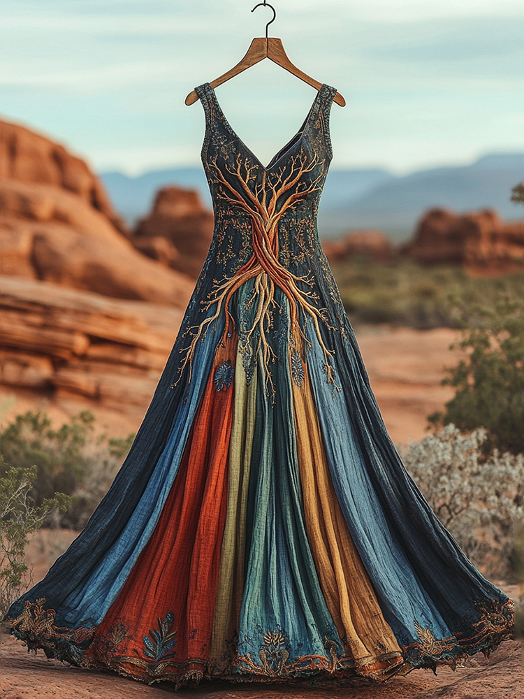 Vintage Celtic Knot Tree Of Life Patchwork Contrast Color V Neck Maxi Dress