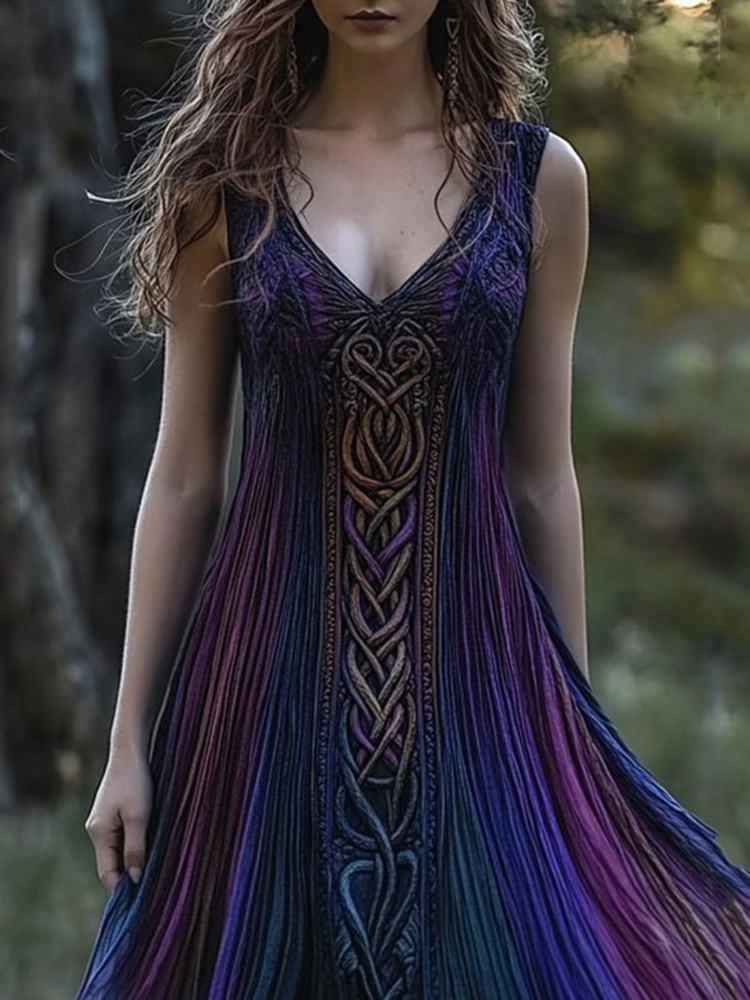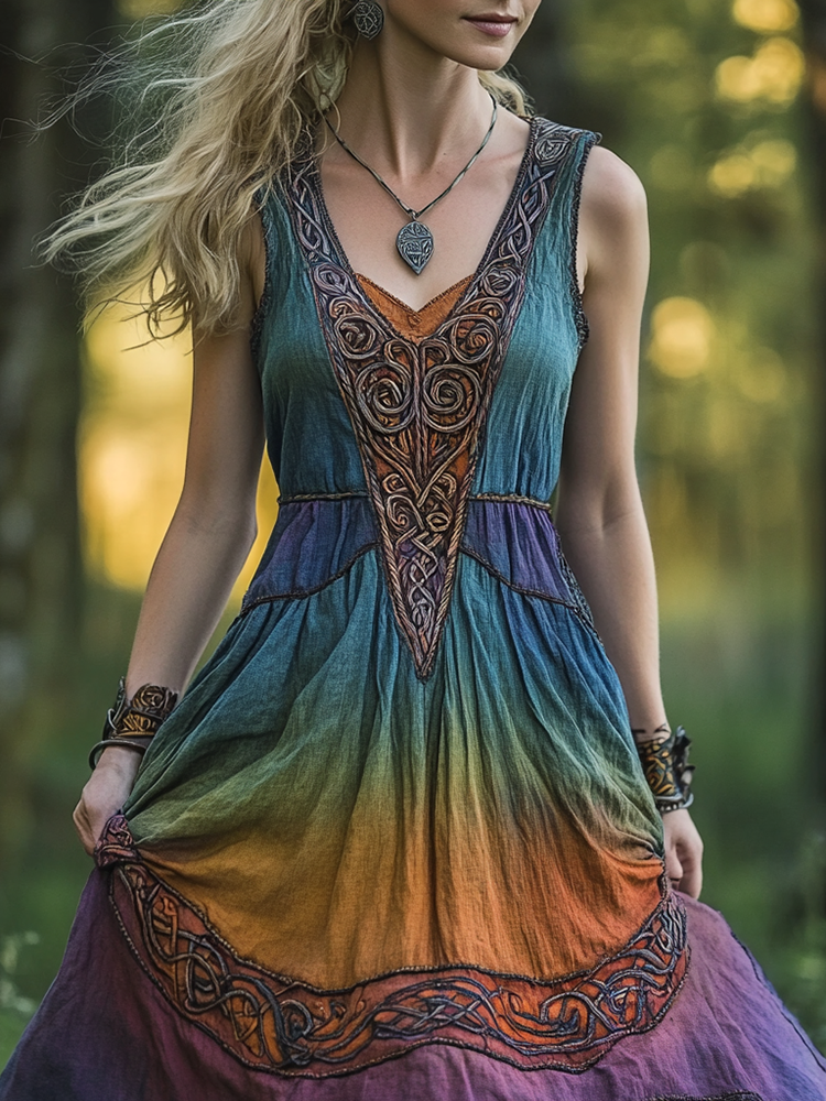 Vintage Viking Pattern Gradient Casual V Neck Tank Dress