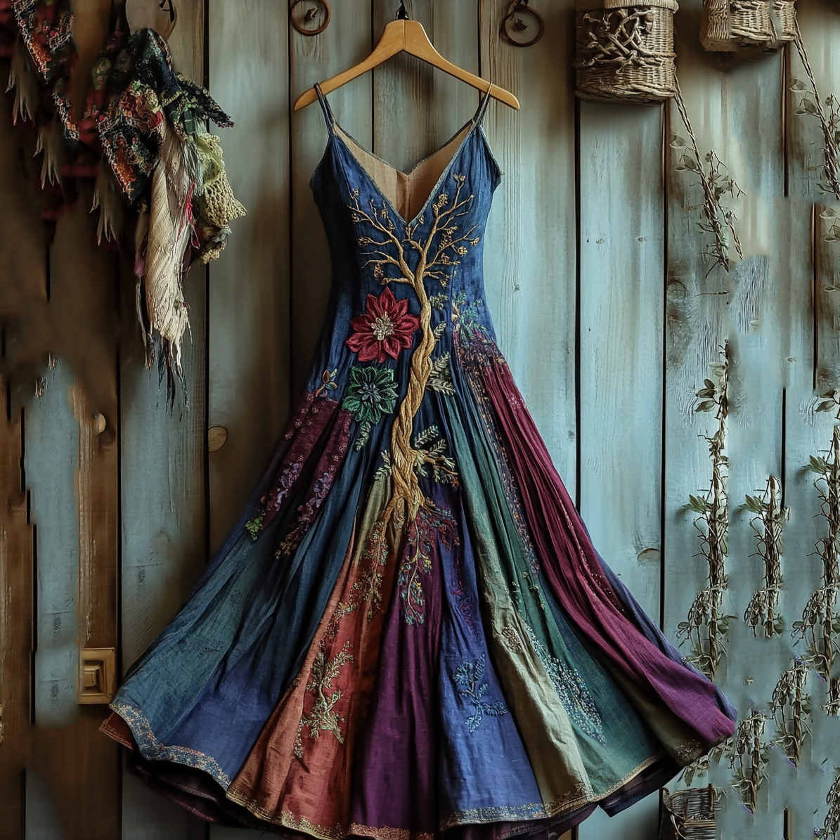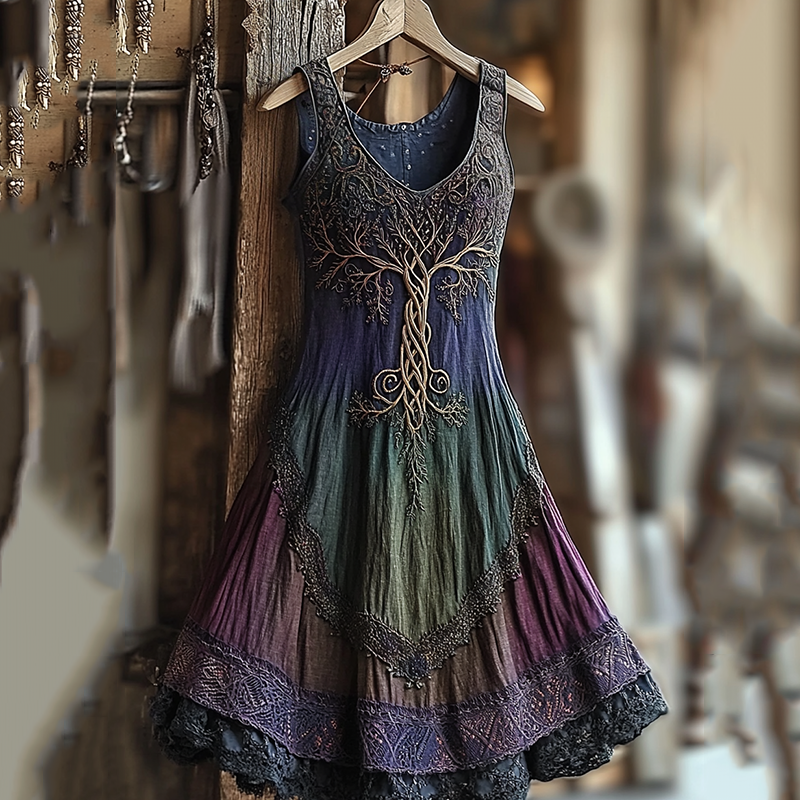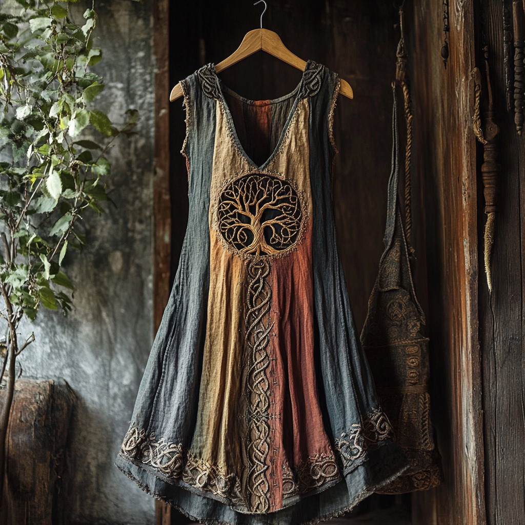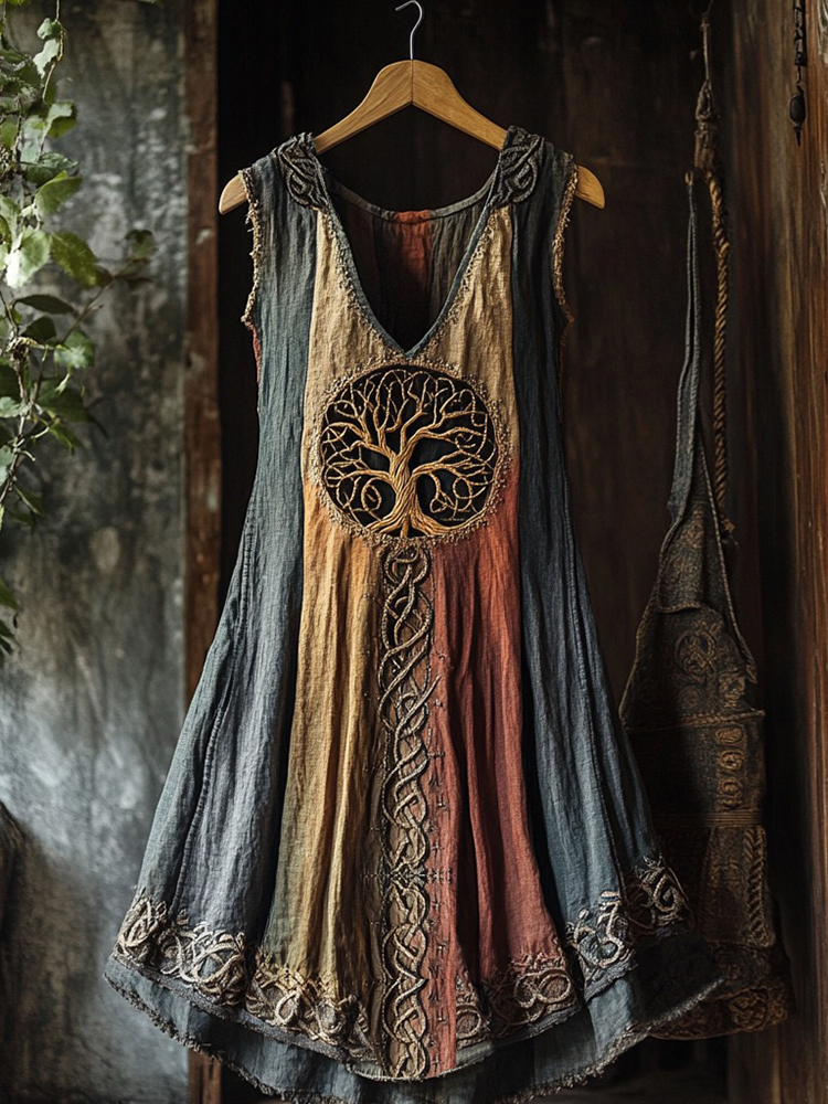 Women's Vintage Viking Tree Of Life Celtic Knot Colorful Patchwork Art Linen Vest Dress