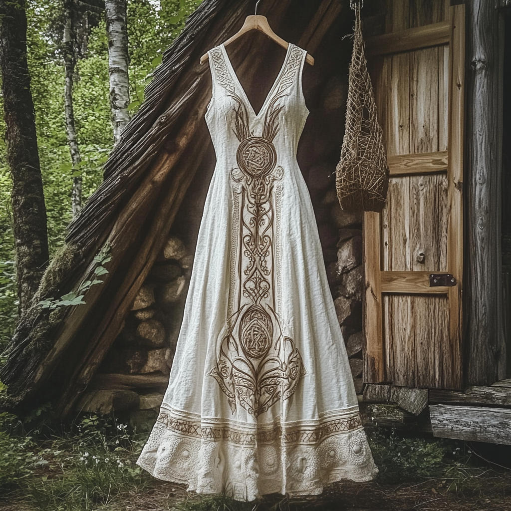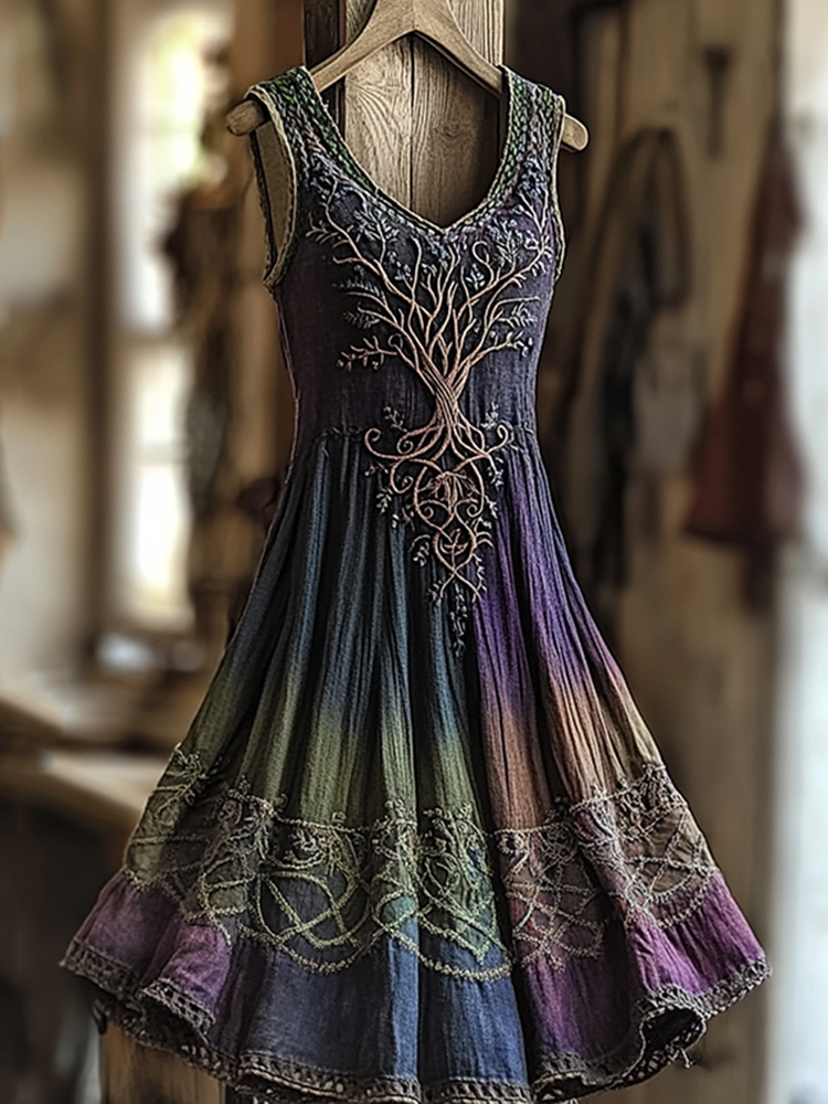Nordic Myth Tree Of Life Embroidered Women's Linen V-neck Vest Midi Dress