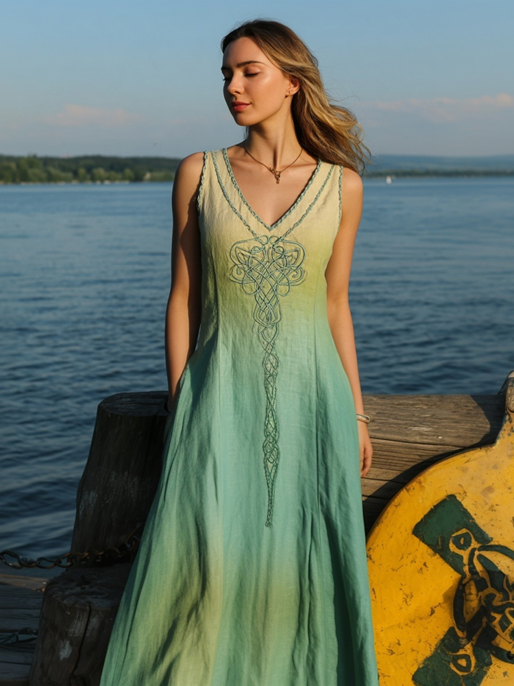 Viking Inspire Celtic Knot Embroidered Gradient Linen Maxi Dress