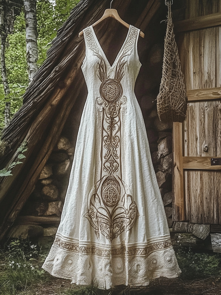 Women's Vintage Viking Celtic Rune Print Cotton And Linen Sleeveless Dress