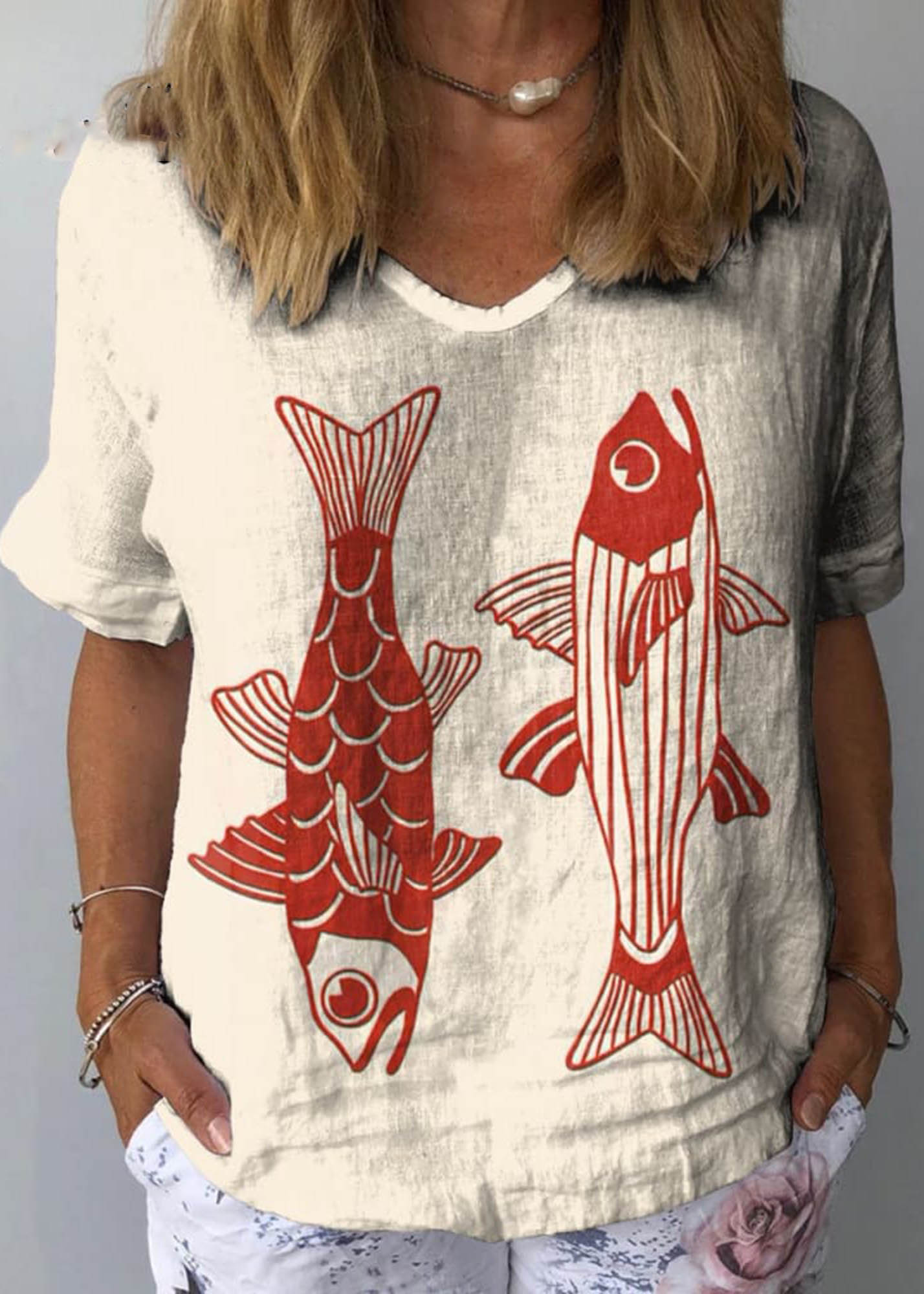 Women's Red Fish Vintage Art Print Casual Cotton And Linen Shirt