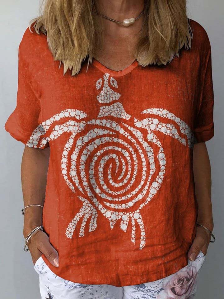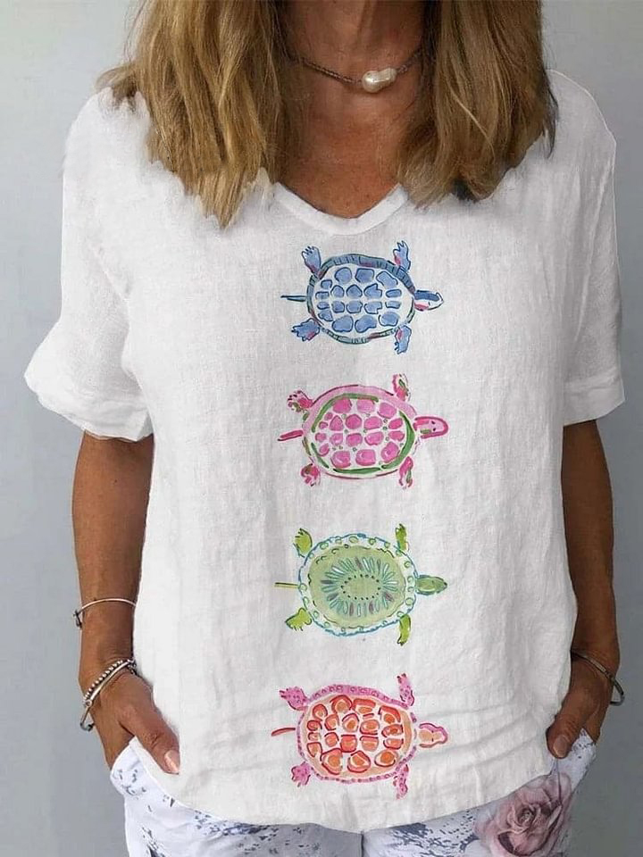 Women's Turtle Watercolor Pattern Print Cotton And Linen Top