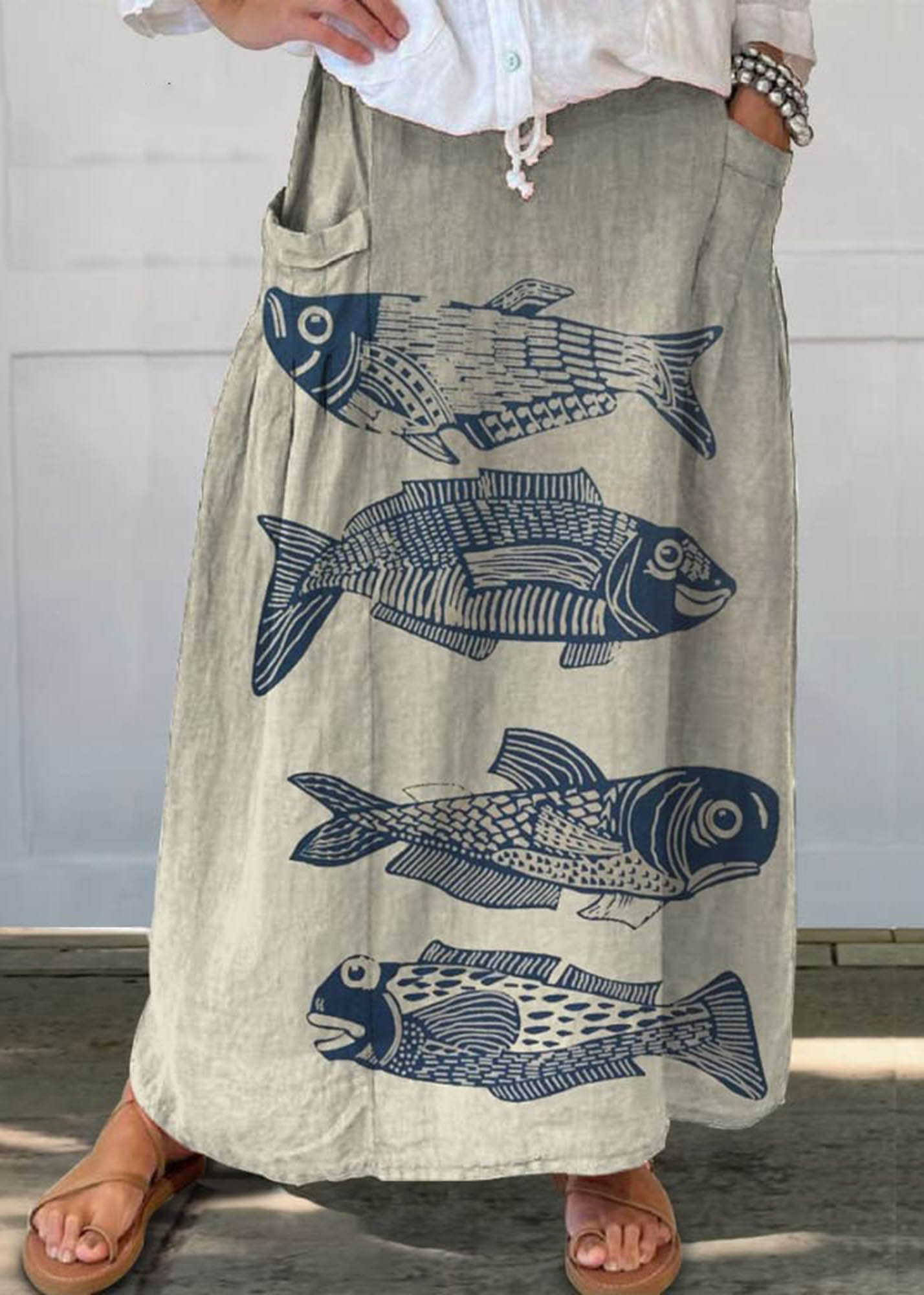Women's Fish Art Print Linen Pocket Skirt