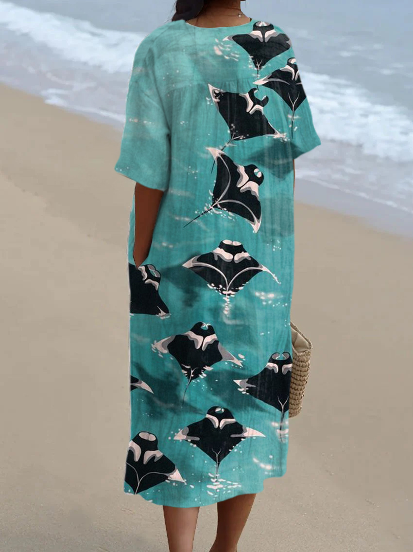 Ocean Manta Ray Loose V-neck Midi Dress
