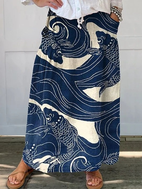 Women's Vintage Lovely Fish Art Print Casual Linen Pocket Skirt
