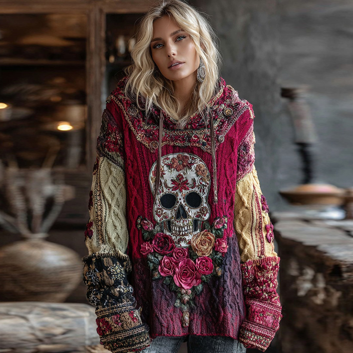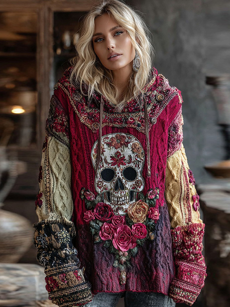 Bohemian Rose And Skull Inspired Colorblock Design Cozy Knit Hooded Sweater