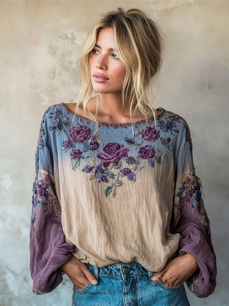 Boho Romantic Floral Embroidery Gradient Women's Linen Loose Shirt