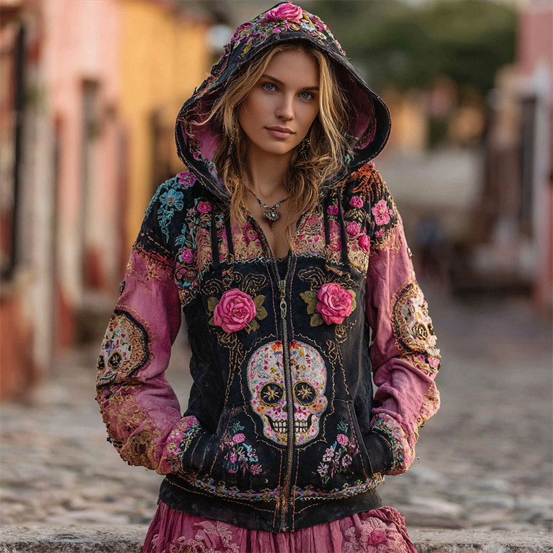Day Of The Dead Sugar Skulls Roses Colorblock Full Zip Hoodie