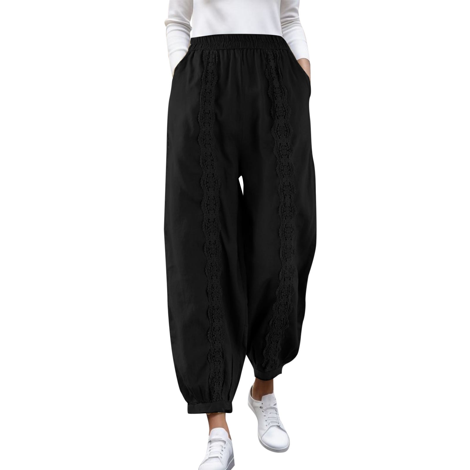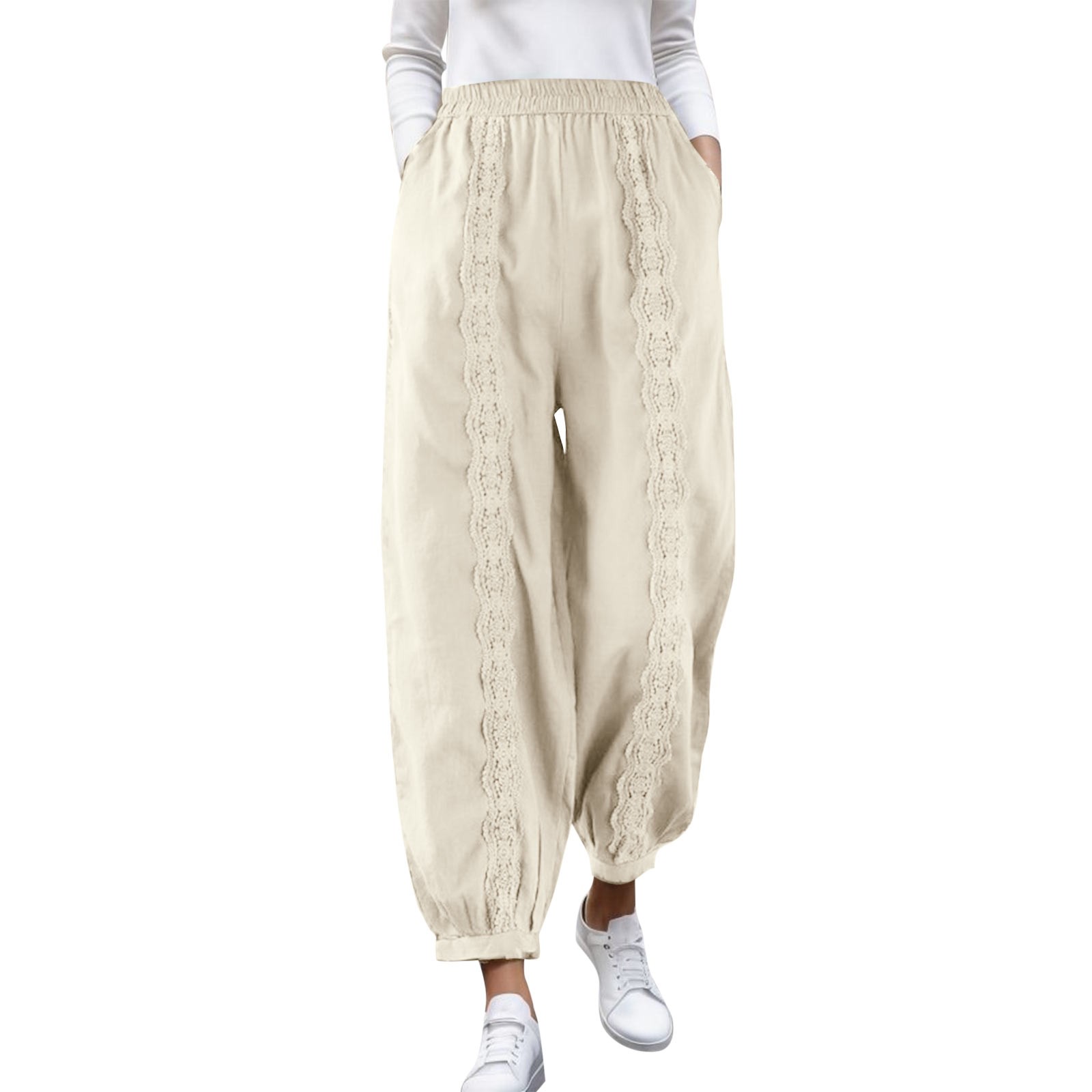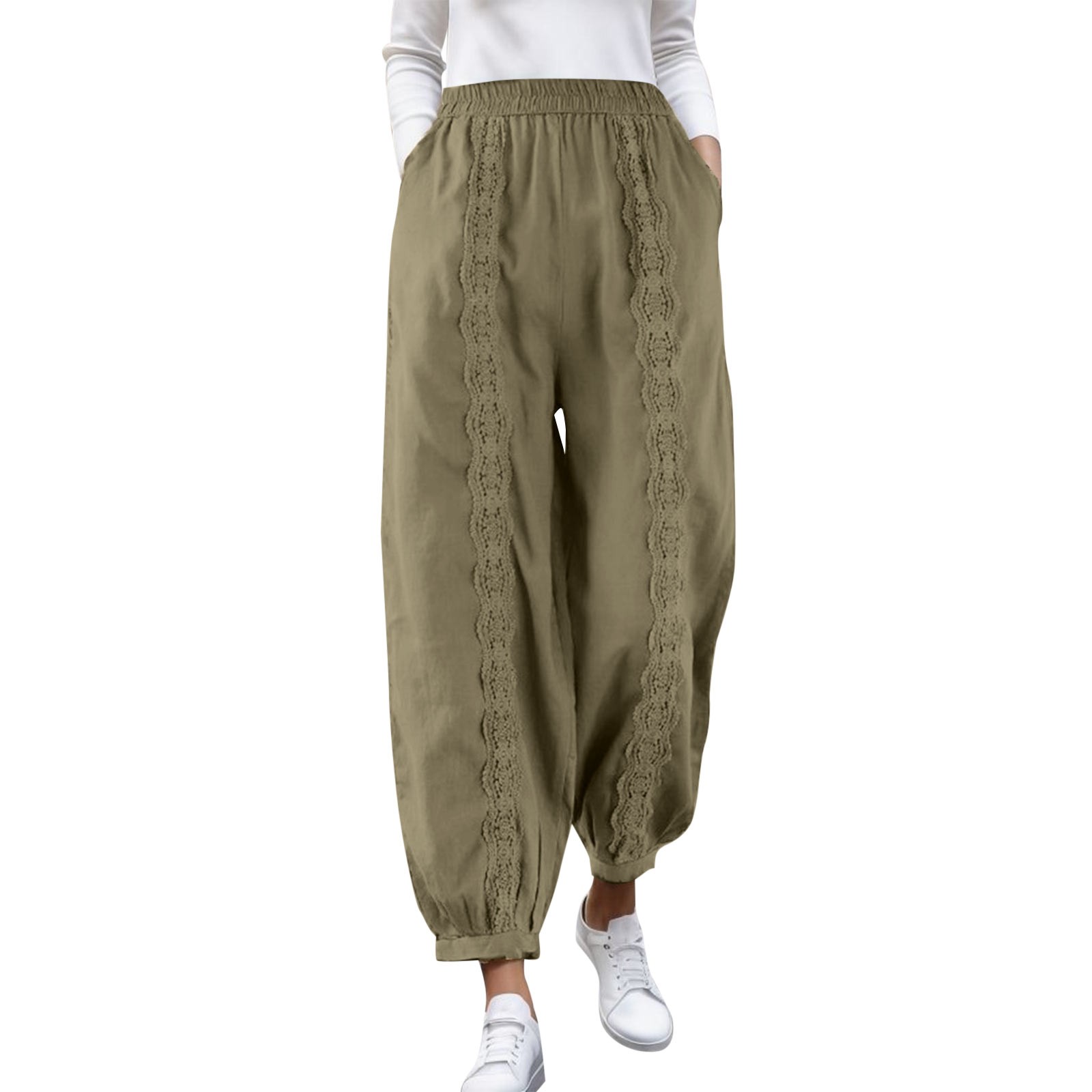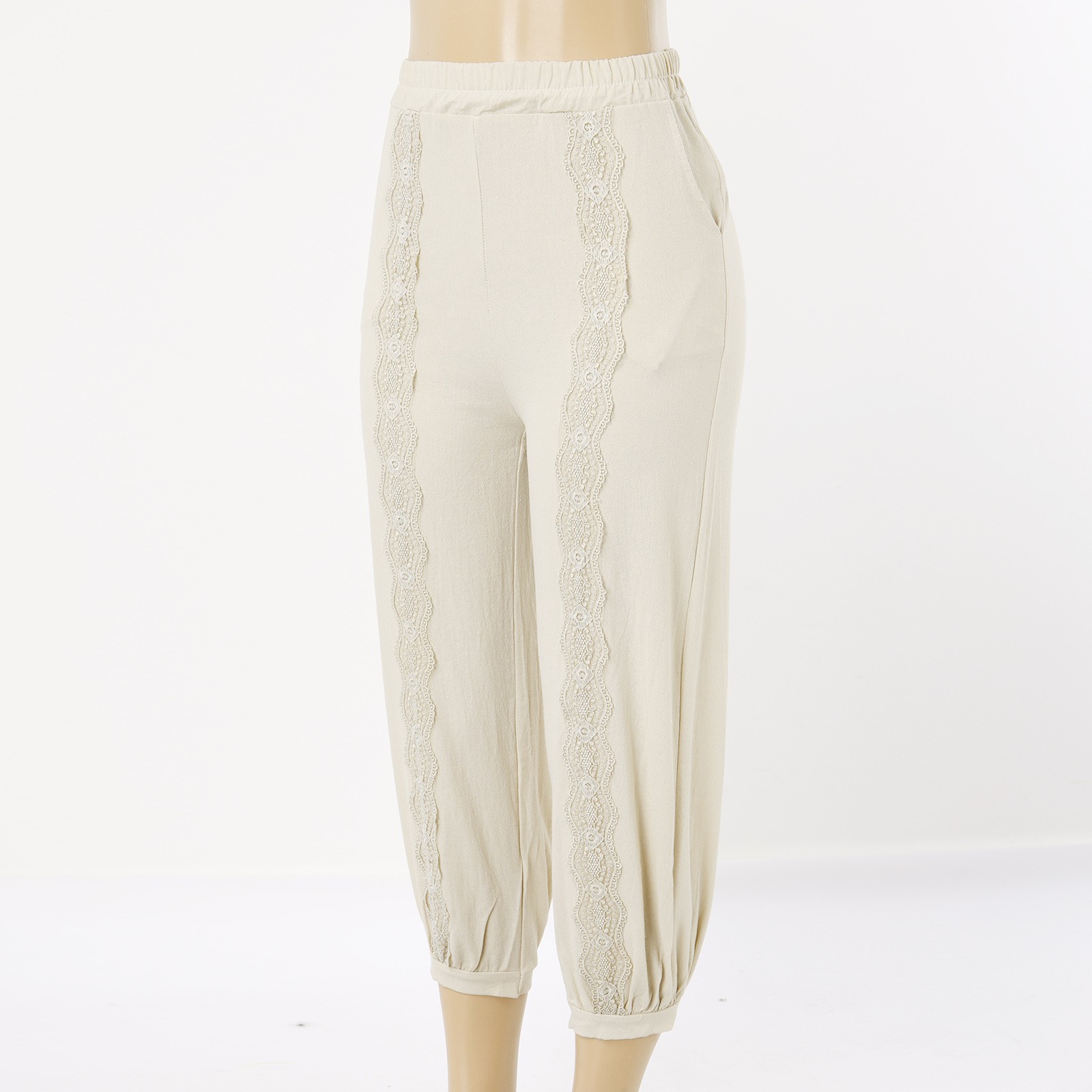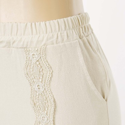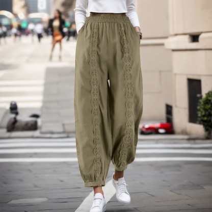 Fashion Casual Cotton Linen Solid Color Loose Elastic Lace Harem Pants