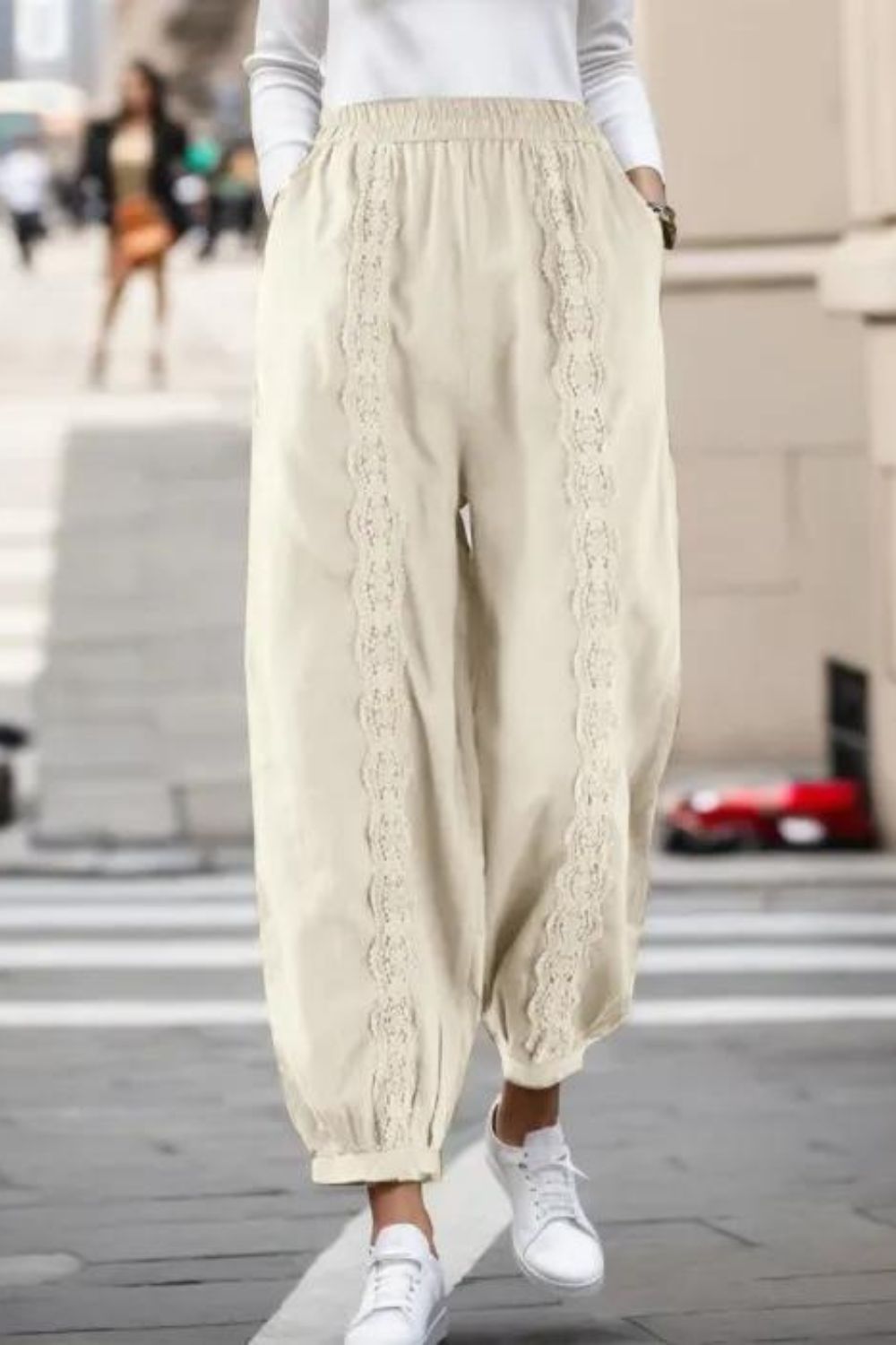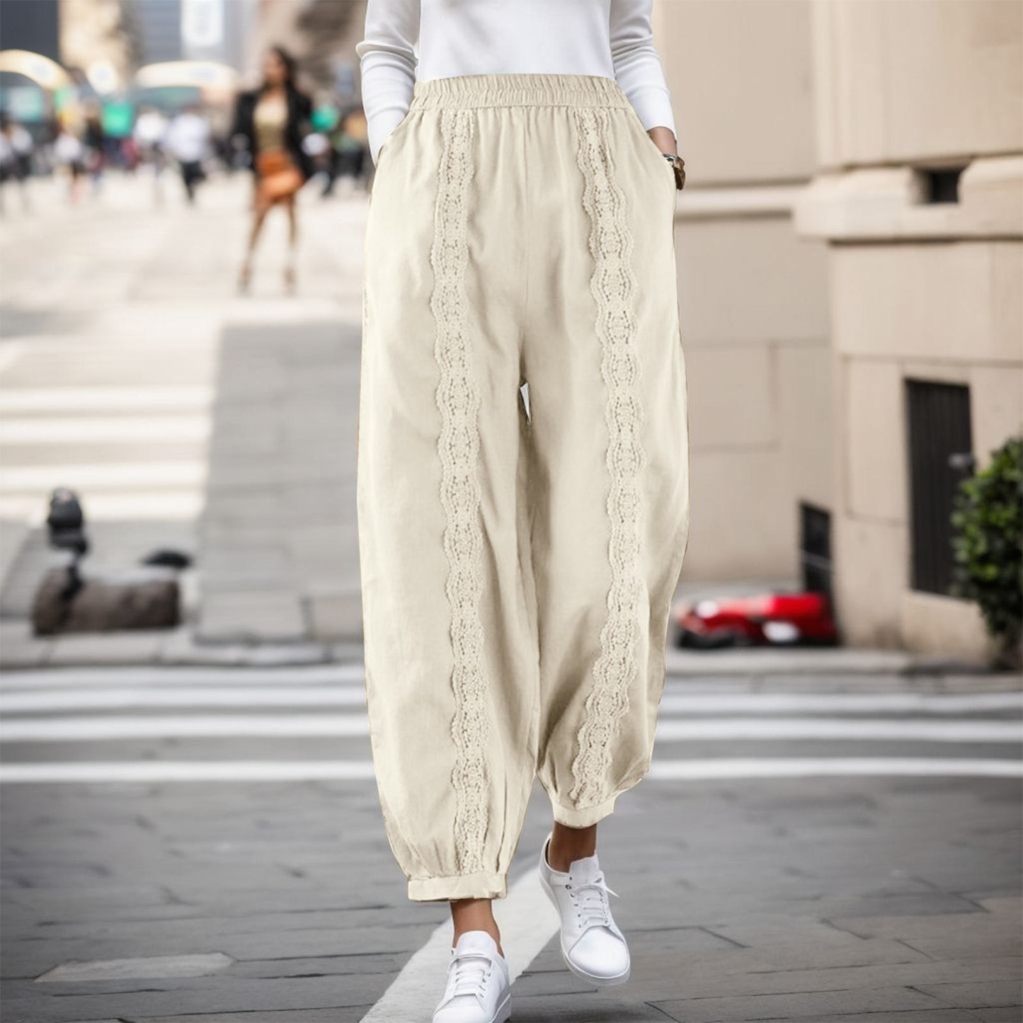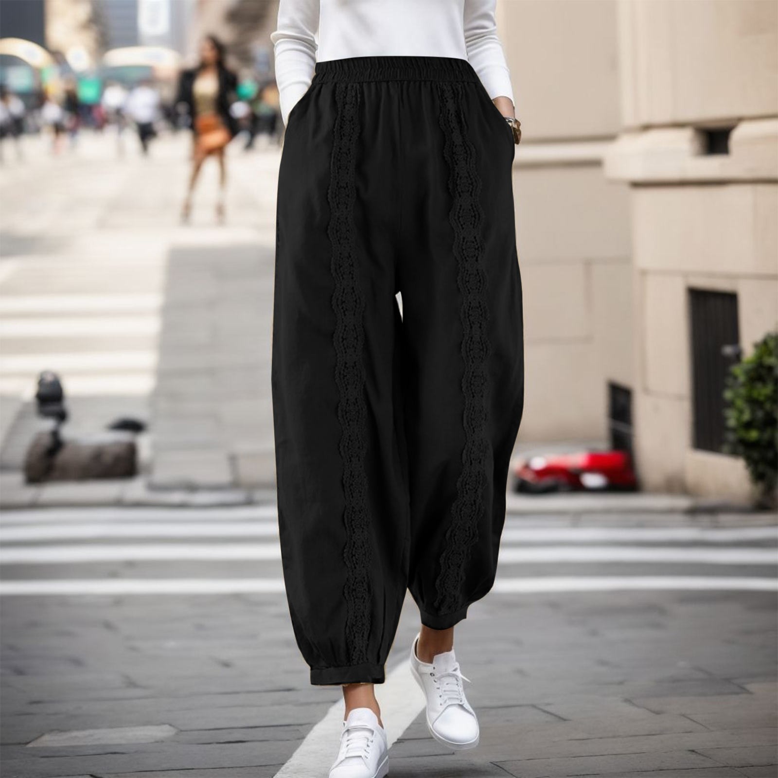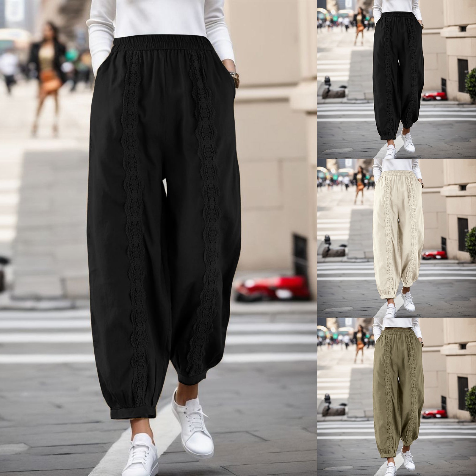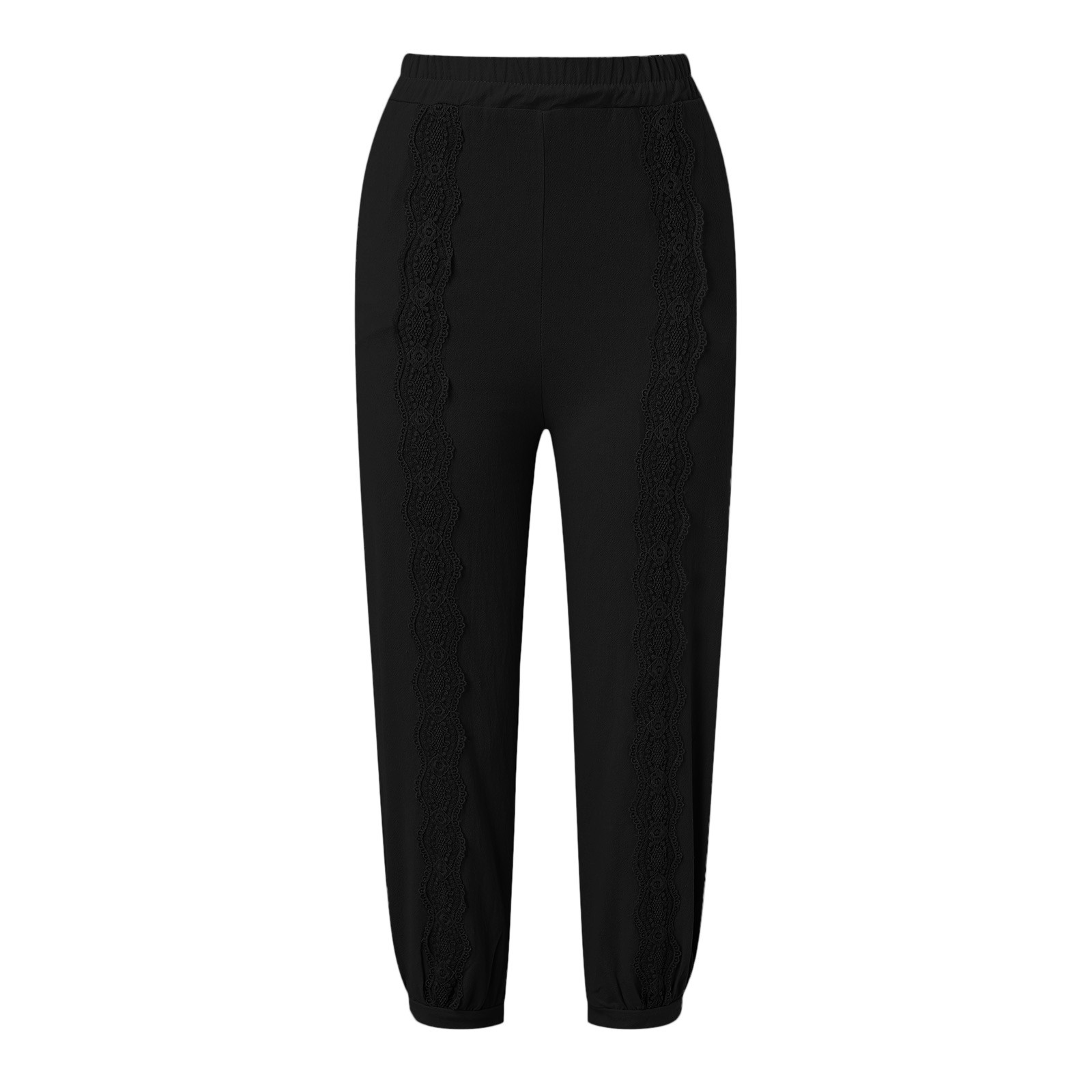 Fashion Casual Cotton Linen Solid Color Loose Elastic Lace Harem Pants