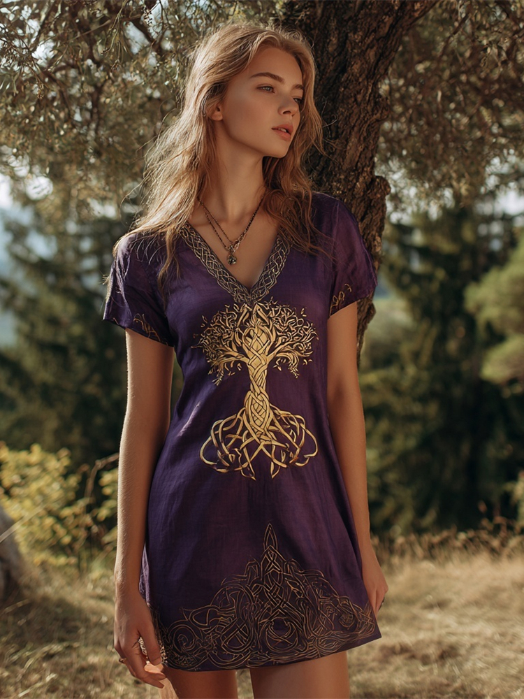 Golden Tree Of Life Embroidery Women's Linen Short Sleeve V-neck Mini Dress