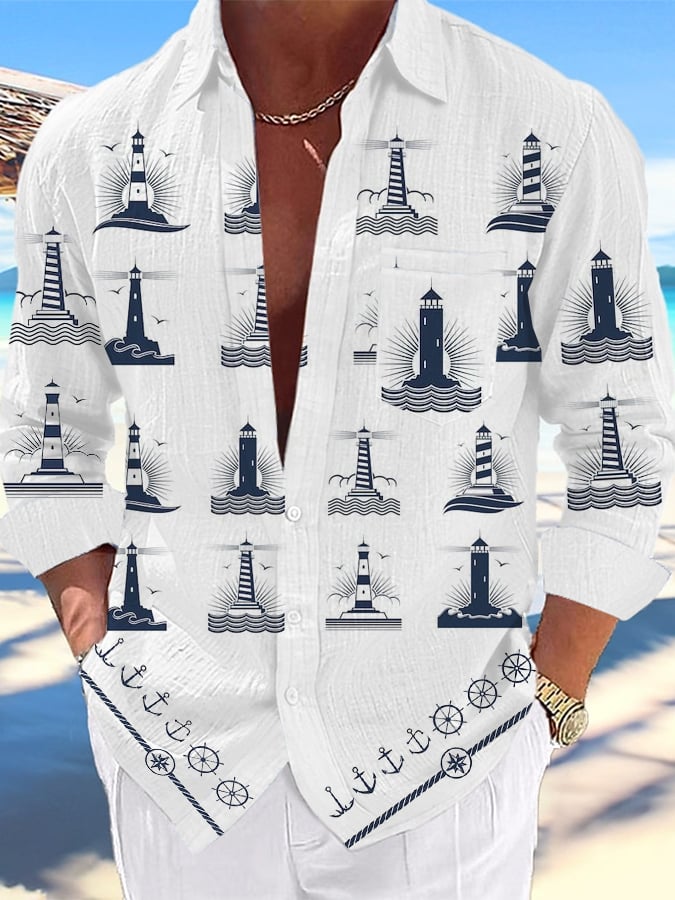 Men's Casual Nautical Lighthouse Print Lapel Shirt