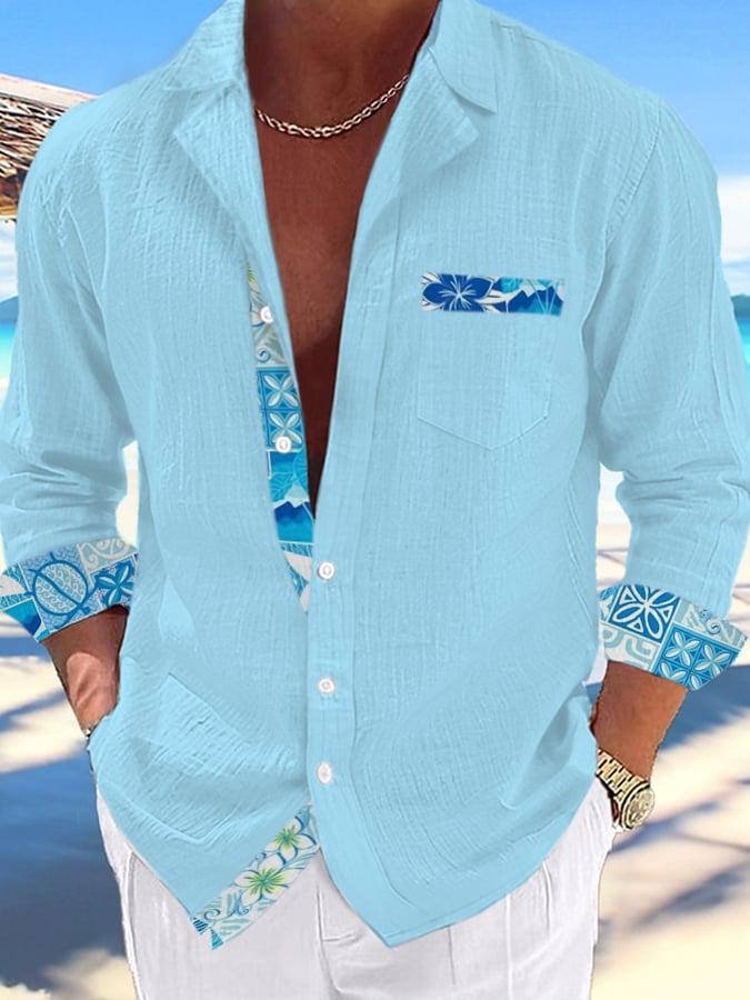 Men's Cuban Collar Hawaiian Print Fashionable Resort Casual Shirt (With Pockets)