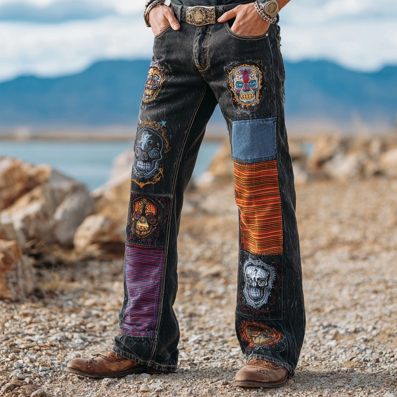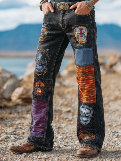 Men's Halloween Skull Embroidered Patchwork Washed Bootcut Jeans