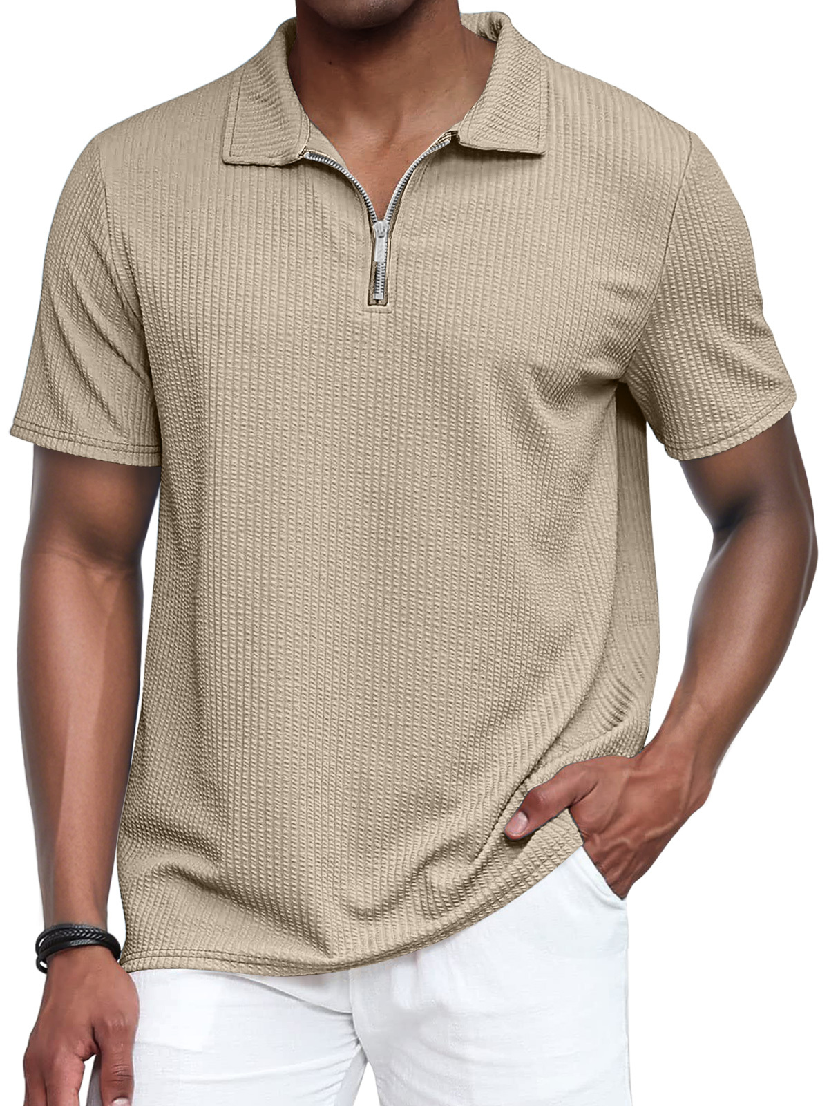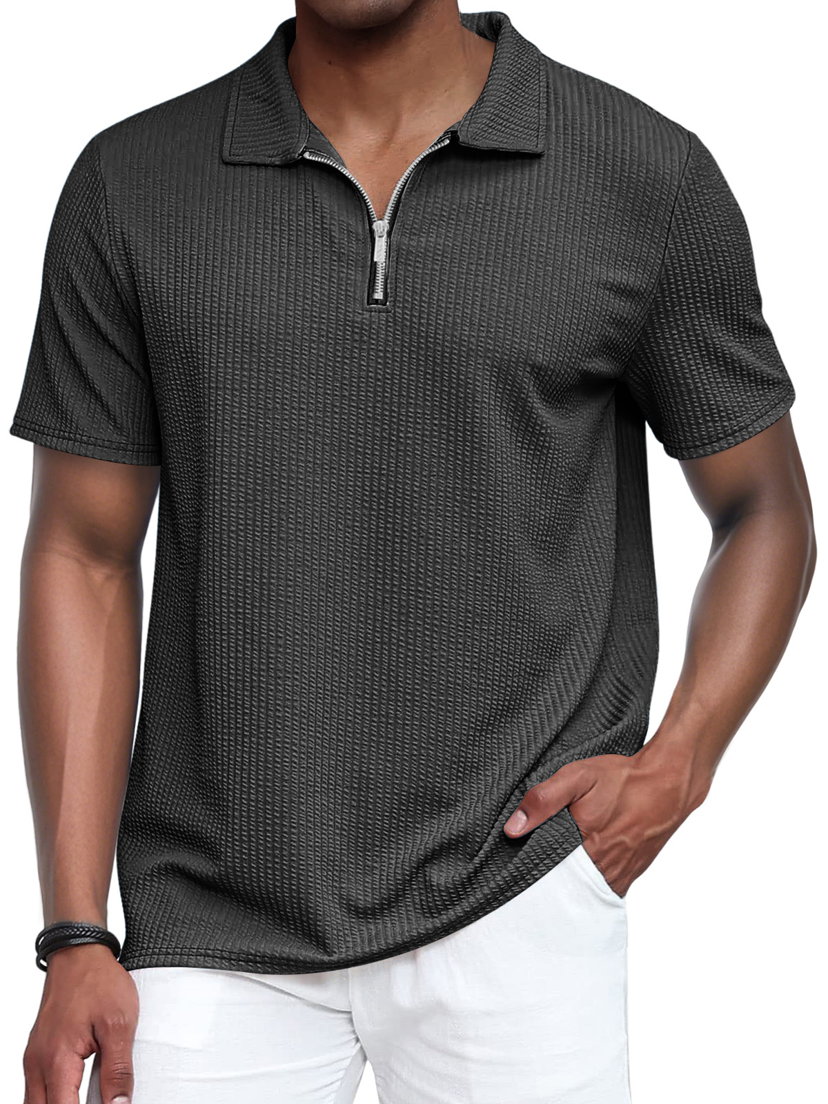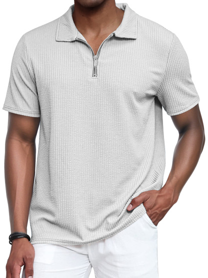 Men's Vertical Textured Lapel Zipper Casual Short Sleeve POLO Shirt
