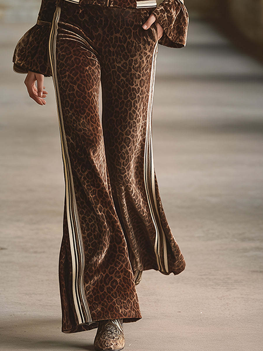 Retro Sporty Brown Leopard Print Lapel Front Zip-up Top And Flared Pants Velvet Set