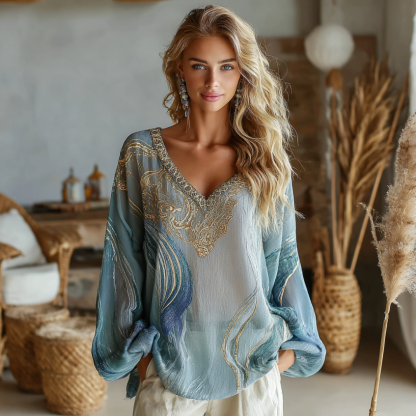 Vintage Marble Texture Collection Bohemia Women Style Gradient Gilded Pattern Linen Round Neck T-shirt