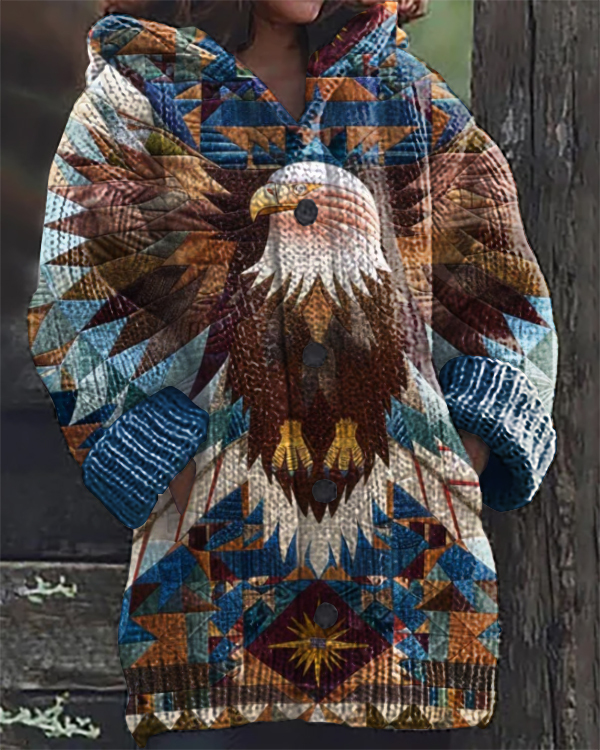Vintage Native Eagle Print Casual Hooded Cardigan